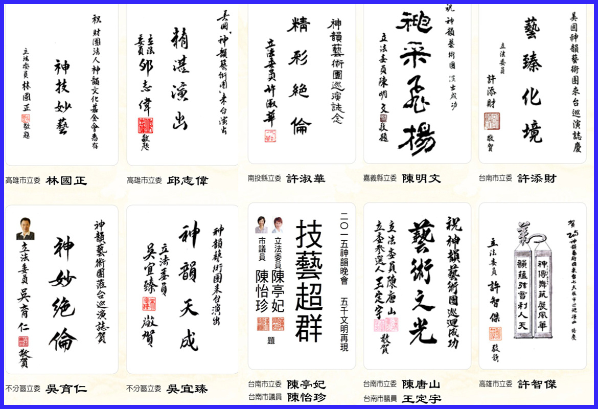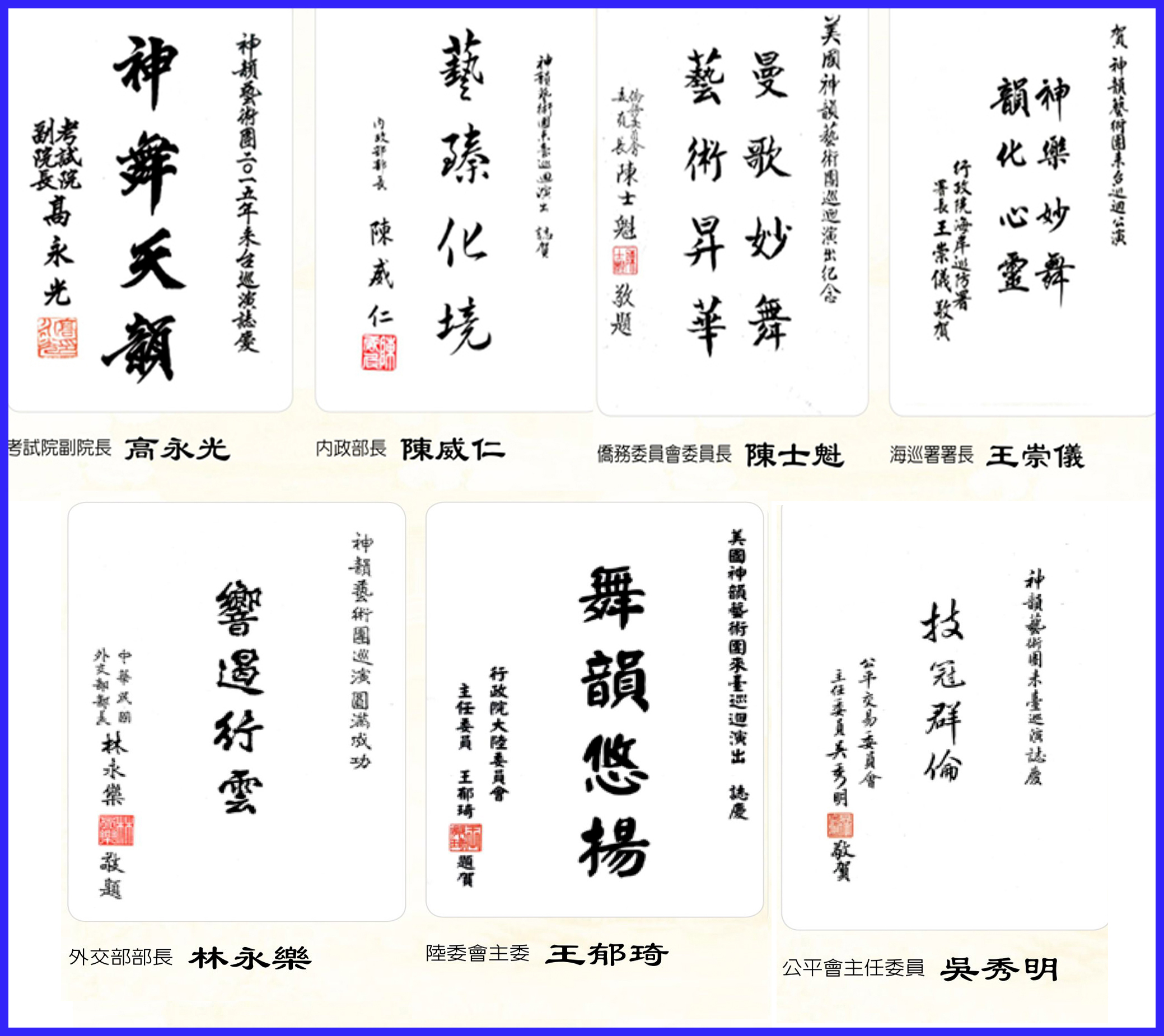 图3:台湾中央部会首长包括考试院副院长高永光、内政部长陈威仁、外交部长林永乐、前陆委会主委王郁琦等七位首长发文迎接神韵。