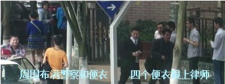 非法庭审过后,律师走出法院四个便衣立即跟上,想对律师动手动脚,律师只好退进法院打电话叫车来,四个便衣中一人马上打的跟上律师的车。
