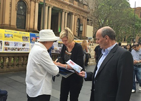 四月十日,法轮功学员在悉尼市政厅前的乔治街上举办反活摘器官真相展活动时,世界各国游客和当地民众踊跃签名谴责中共暴行。