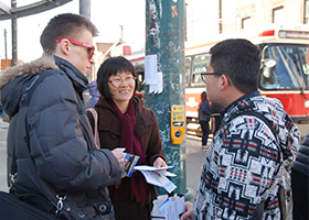 四月十一日,多伦多法轮功学员和部分民众在市中心的中国城举行“声援两亿三退大潮”活动,并在现场讲真相劝三退。