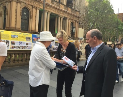 ![]() 悉尼市政厅前,游客和市民关注并谴责中共活摘法轮功学员器官 |