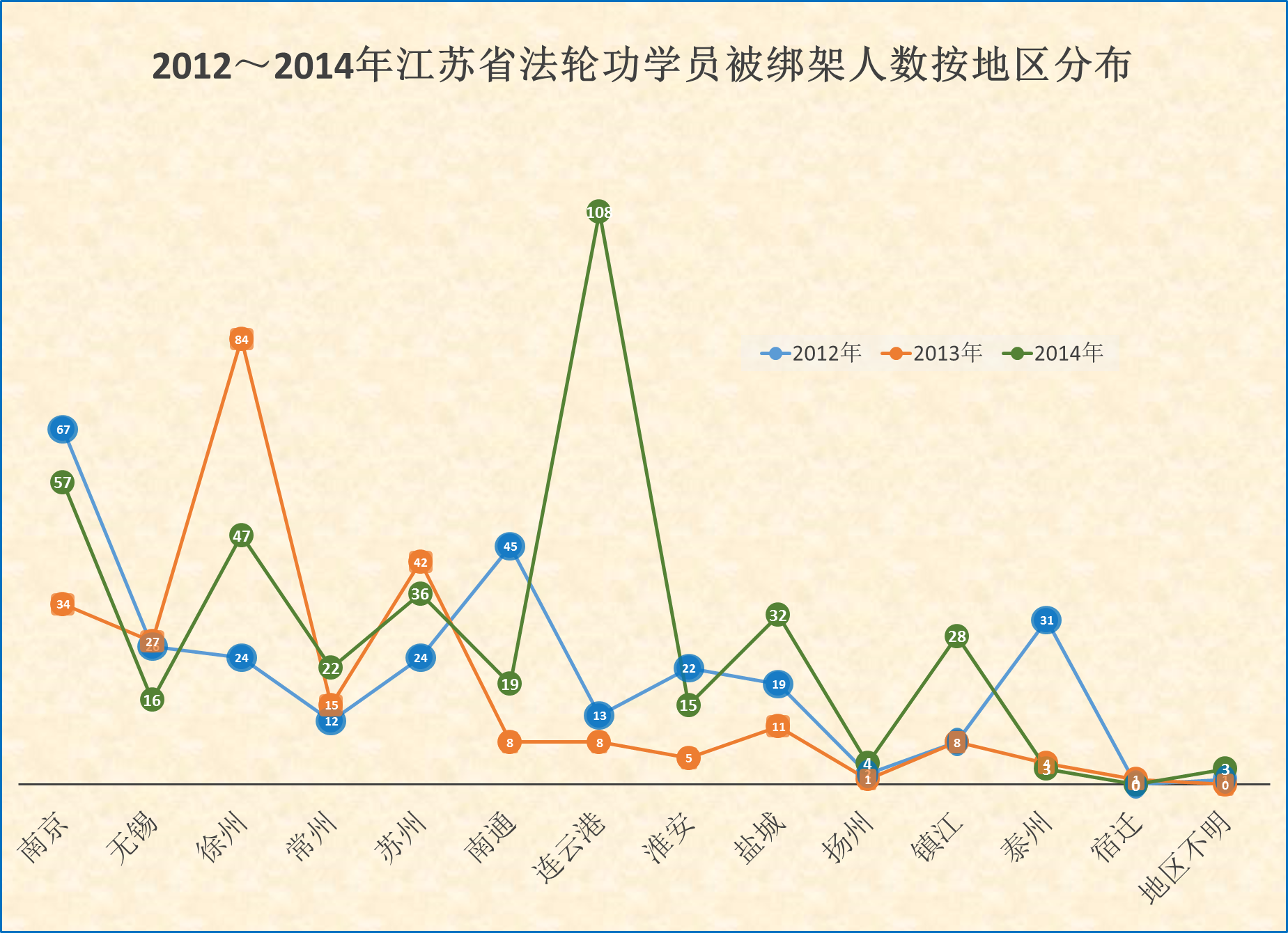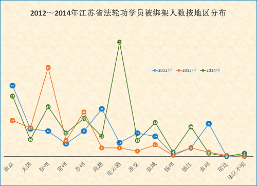 江苏省各地法轮功学员遭绑架迫害人次情况见下表,详情可参见本文附录1《2012-2014年江苏省法轮功学员遭绑架部份名录》。