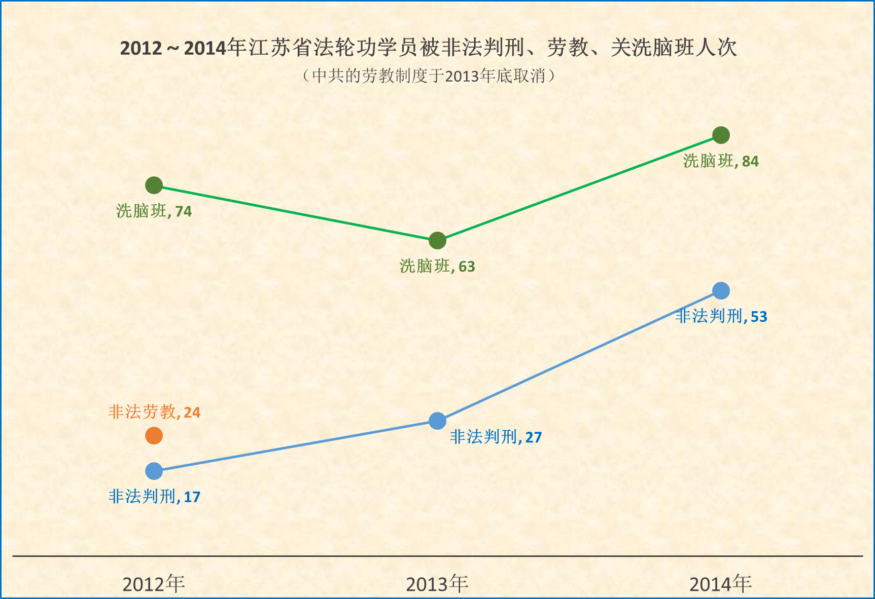另外,根据明慧网二零一二年至二零一五年三月的信息,本文对江苏省二零一二前的迫害信息进行了增补,遭冤狱迫害七十九例、非法劳教迫害九十六例、精神病院及药物迫害十六例,洗脑班迫害二百九十九人次。