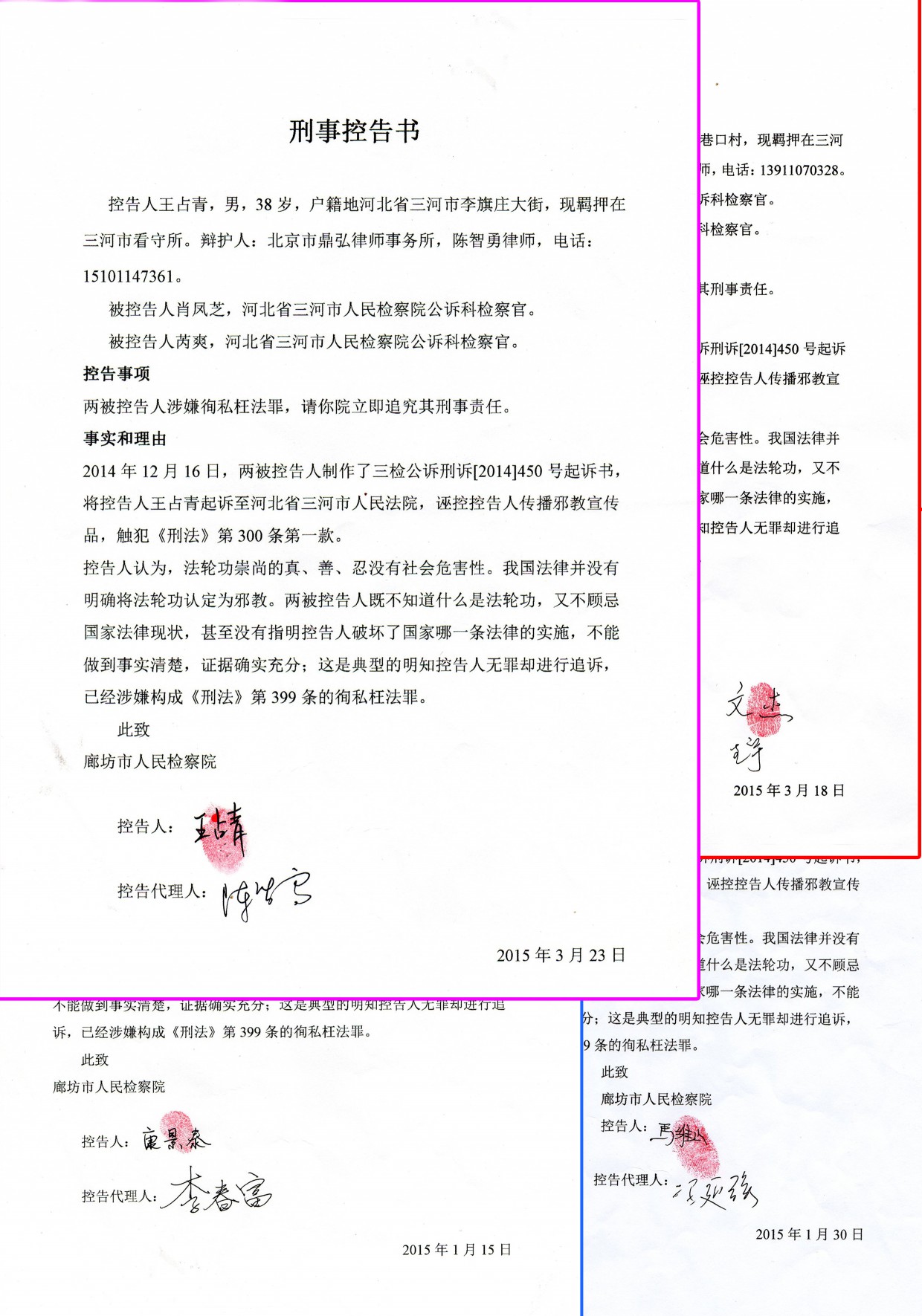 陈智勇律师提交当事人王占青的《刑事控告书》;冯延强律师提交当事人马维山的《刑事控告书》;陈冯二位律师代表王宇律师、李春富律师,提交当事人文杰、康景泰的《刑事控告书》。四当事人及其代理律师,控告三河市检察官肖凤芝、芮爽涉嫌徇私枉法罪。
