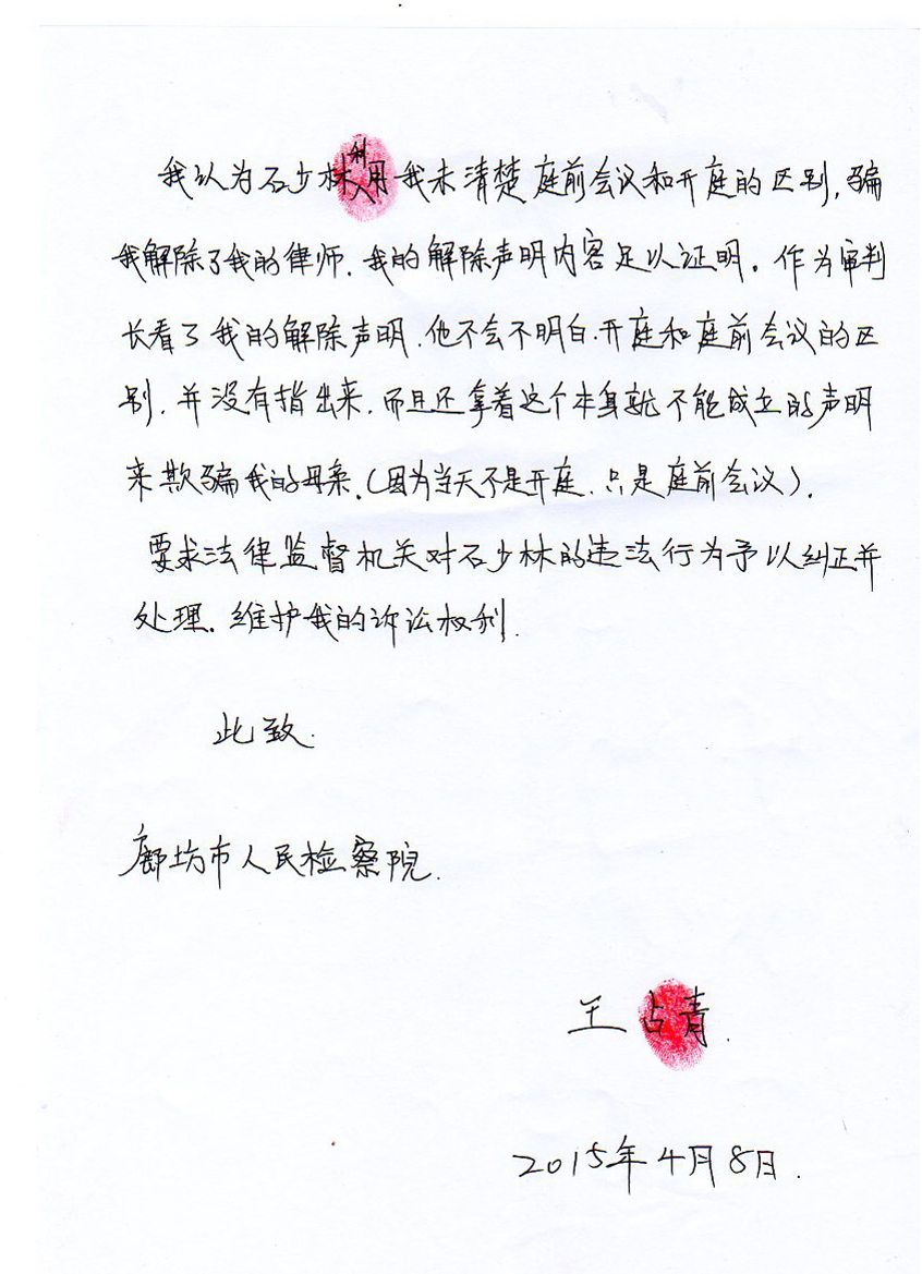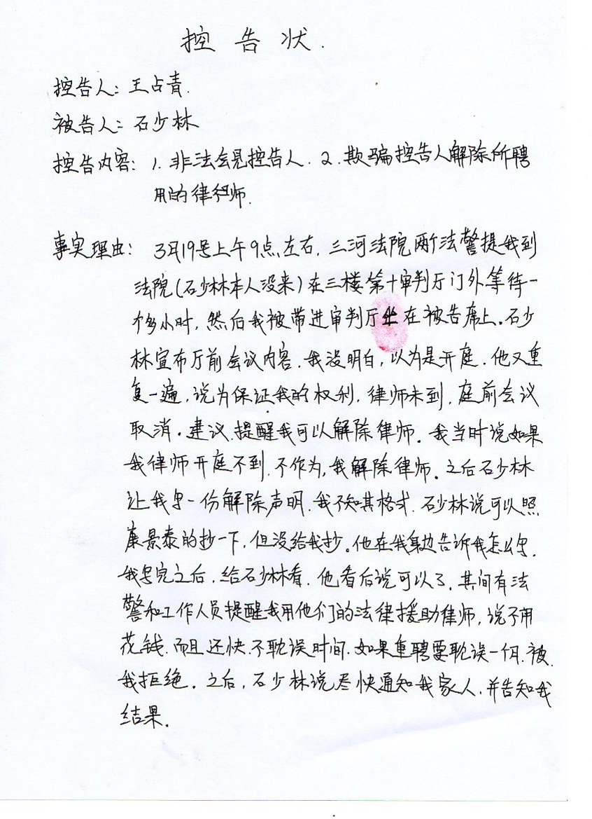 陈智勇律师提交王占青亲手写的《刑事控告状》,控告三河市法官石少林欺骗他解除对陈智勇律师的委托,涉嫌滥用职权罪。