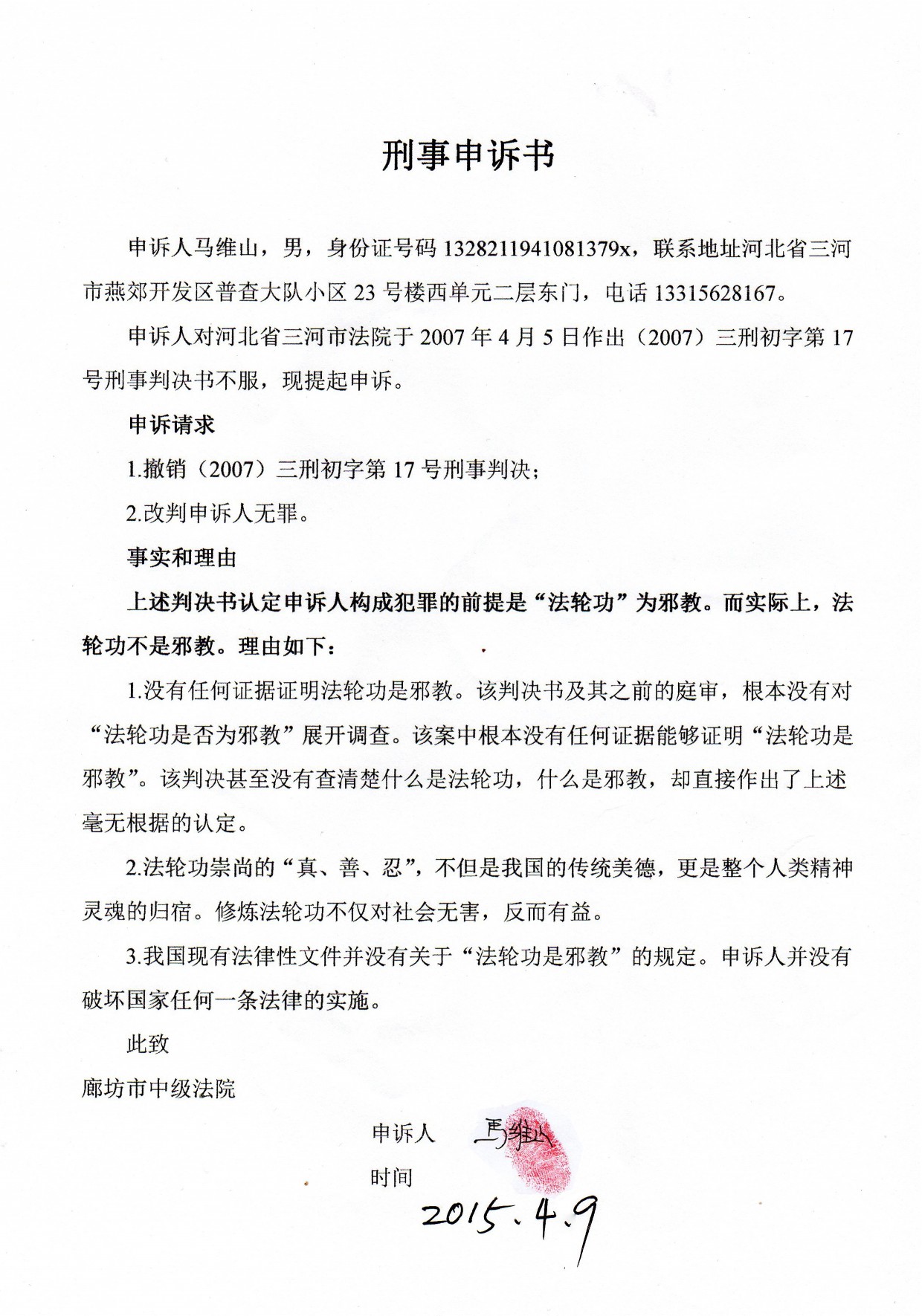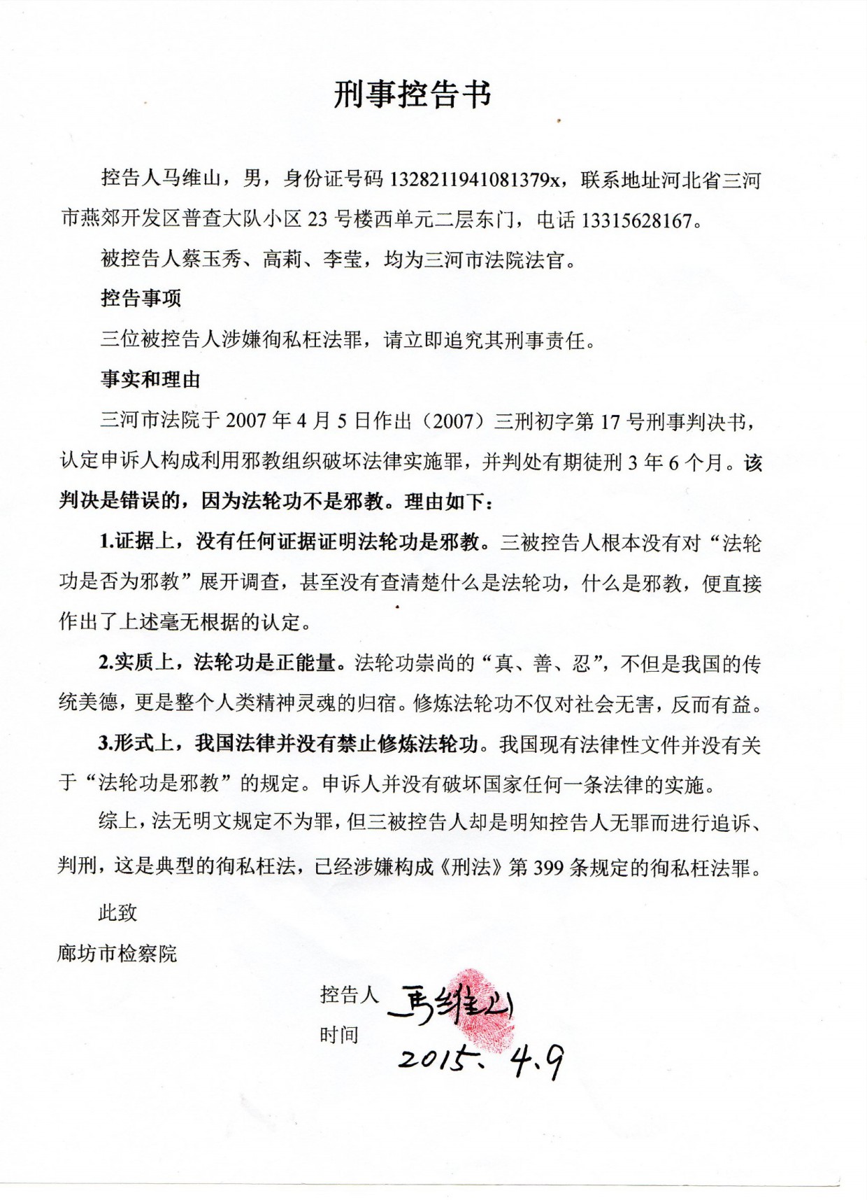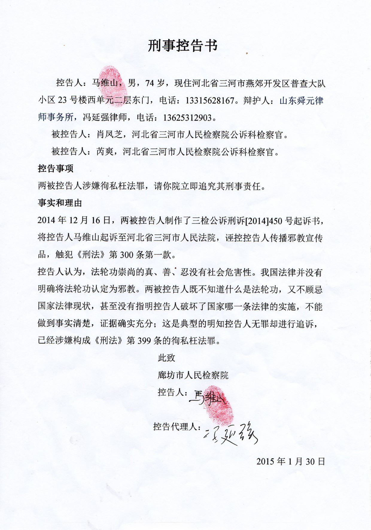 二零一五年四月九日下午,冯延强律师代表马维山老人(75岁),向廊坊市检察院邮寄了《刑事控告书》,控告二零零七年三河市法官蔡玉秀、李莹、高莉对马维山等九人做出的违法刑事判决,控告上述三人涉嫌构成《刑法》第399条的徇私枉法罪;向廊坊市中级法院邮寄《刑事申诉书》,申请撤销(2007)三初字第17号刑事判决,要求改判申诉人无罪;还向河北省政府邮寄《行政复议申诉书》,要求公开设立廊坊洗脑班的法律依据。
