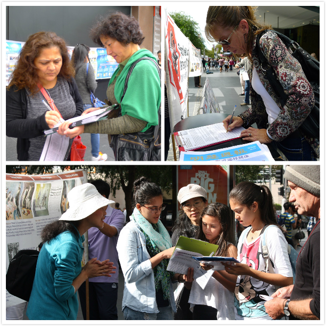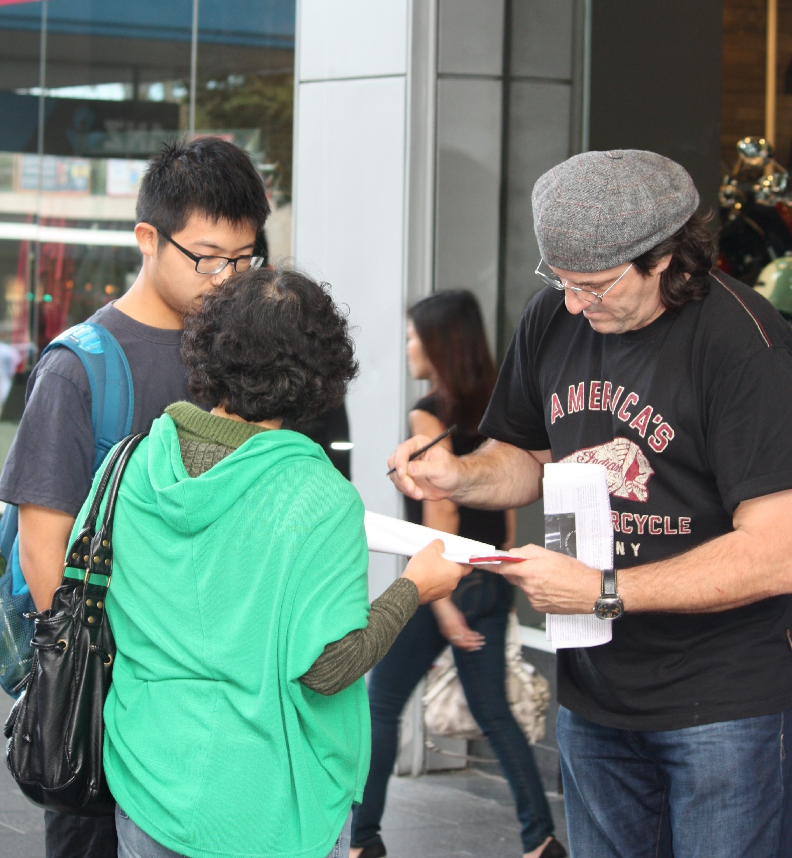 附近的商场中有很多工作人员在繁忙中抽空出来签名反“活摘”。人多的时候,他们就耐心地排队等待签名。在一旁摩托车商场工作的杰克(Jake)就是一个,他说:我从商店门口看到你们的真相展板就过来看看,想要支持,我会回去告诉我的同事,让他们都来签,我还会把这个消息放到我的脸书上告诉更多的人。