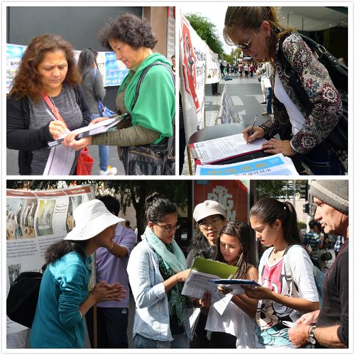 法轮功学员凯瑟琳(Kathrine)告诉记者,车士活是她工作所在地,她今天一直站在这里向路人讲活摘器官真相,遇到了很多熟人和同事。凯瑟琳告诉记者说:他们问我为何站在这里?我就告诉他们展板上的内容,他们都非常愿意来了解真相,并主动把我手里的反活摘器官征签表拿去,签名支持法轮功。
