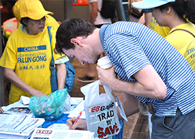 - 布里斯本民众积极签名反“活摘”(图)- 四月十七日傍晚的布里斯本市中心,上班族在回家的路上,了解到中共“活摘”器官的罪行,三小时超过五百人签名支持法轮功反迫害。