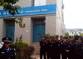 - 开庭迫害四位好人 昆明市寻甸县法院戒备森严(图)- 四月十日,两辆全副武装的特警车驶入昆明寻甸县法院,车上跳下二十来个特警,拉上警戒线围住法院;又开来十多辆警车……