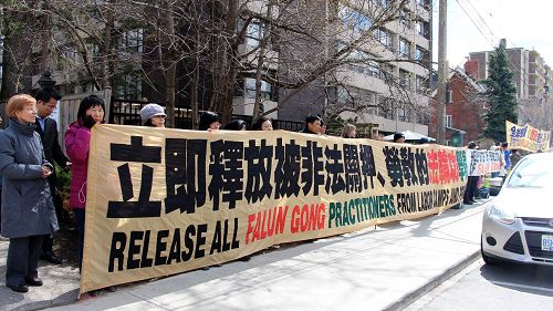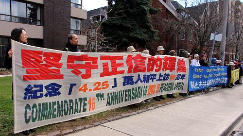 多伦多法轮功学员的集会就象当年四二五的场景一样,绵延不绝的队伍静静地打着横幅,两个小时的集会完后,也是静静地离去。在集会现场,多伦多警方派来一些警察,值班的警察对法轮功学员表示,加拿大有集会自由,我们是来保护你们的。法轮功的真相我们都知道,我们都理解和支持,在这里你们是自由的。同时他们对中共对法轮功的迫害表示谴责。