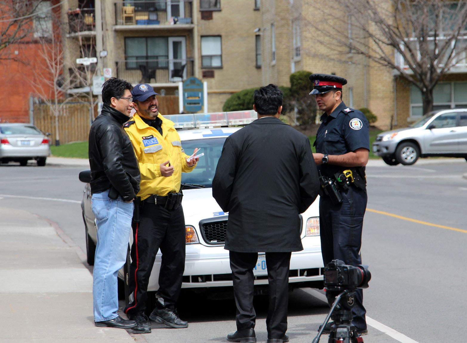 ![]() 图4:多伦多警察对法轮功学员表示:加拿大有集会自由,我们是来保护你们的。 |