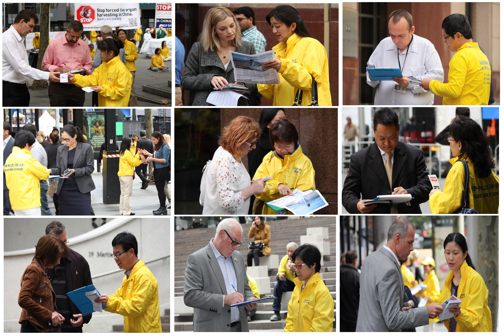 当天在由众多金融和政界聚集的马丁广场上,人流络绎不绝。当过往人士看到一幕幕的以真人演示的反酷刑和活摘器官的展示,听到中共活摘法轮功学员器官、甚至有时为保新鲜而不打麻醉直接摘取器官的惊人黑幕,都非常震惊。尤其是那些看过SBS专题报导栏目Dateline节目或《悉尼晨锋报》、九号台新闻、澳洲新闻集团网、《每日邮报》等澳洲媒体两周前的相关报导的民众纷纷驻足在“中共必须立即停止活摘法轮功学员器官”的征签表上签名。