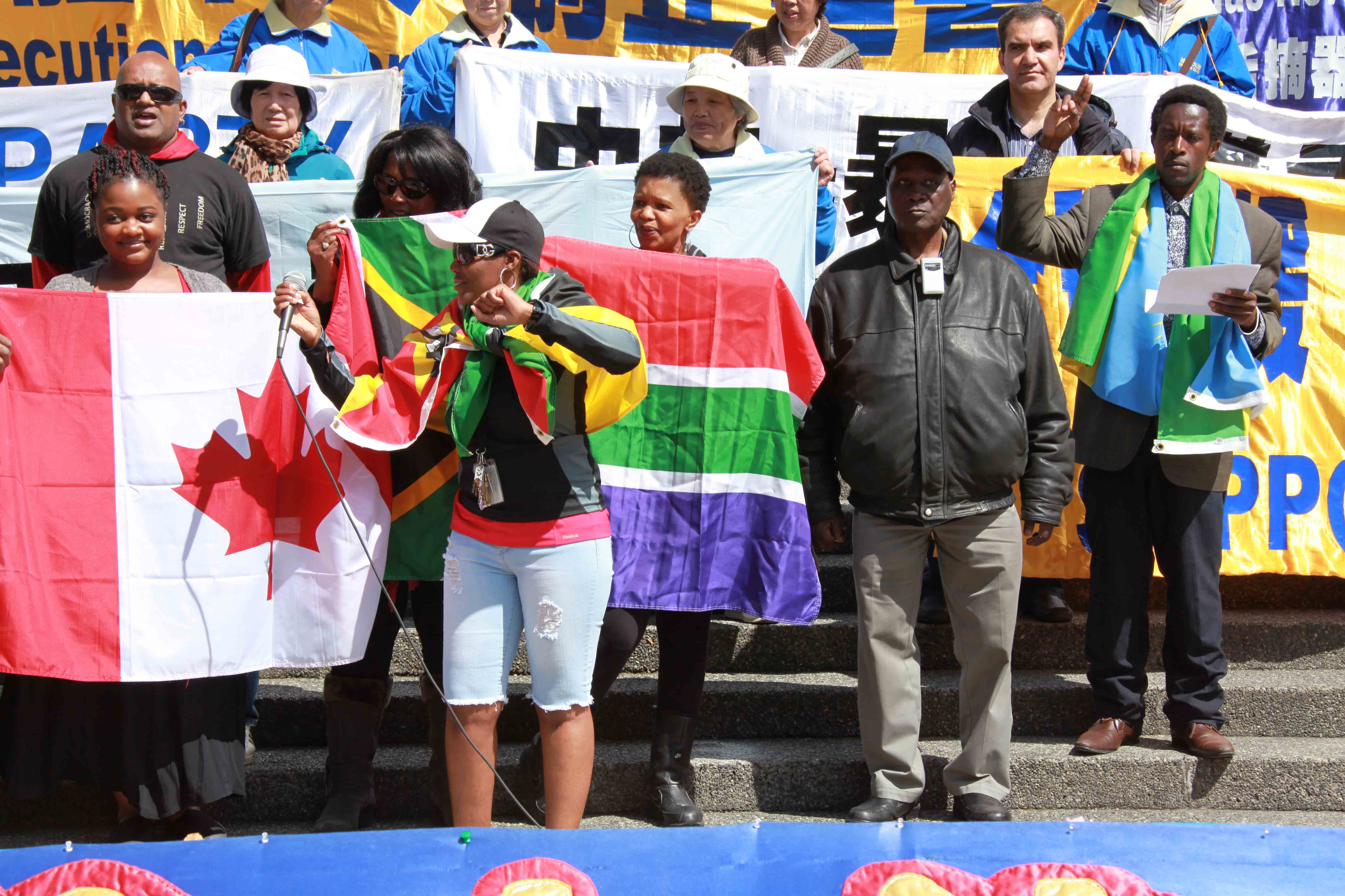 加拿大黑人联合社团创办人亚辛Yasin Kiraga 和一些非洲社团成员也在艺术关附近举行抗议活动,他们也加入了法轮功学员的活动,并现场演唱歌曲表示支持法轮功学员的反迫害活动。亚辛表示,法轮功学员因信仰“真善忍”遭到迫害是无辜的,中共是邪恶的,反对迫害信仰自由是全人类的,他会为法轮功反迫害奔走呼吁,直到迫害停止。