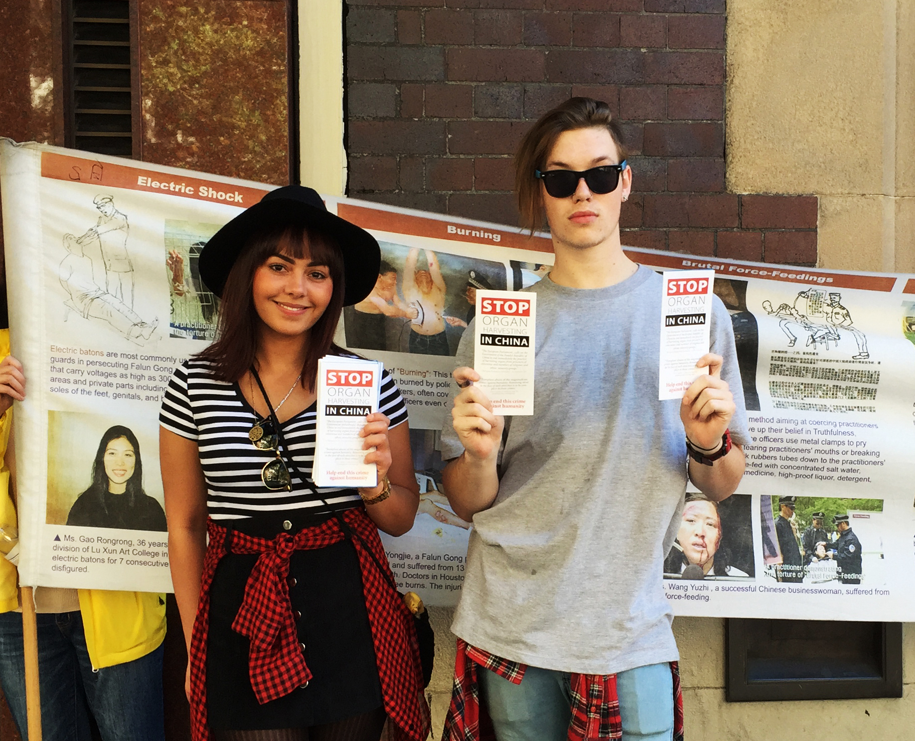 切丽(Cheree Toka)和艾登(Aiden Butfild)在悉尼唐人街转角乔治街上的制止中共活摘法轮功学员器官牟利的真相点得知法轮功学员所遭受的迫害后,主动拿起真相传单向过路民众讲真相,呼吁人们签名反迫害。他们都认为,活摘器官是反人类和反人权的行为,并表示:我们来到乔治街,在这里呆上几个小时,希望能够帮助你们(法轮功学员),通过让其他过路行人签名来帮助制止在中国活摘法轮功学员器官的罪行。