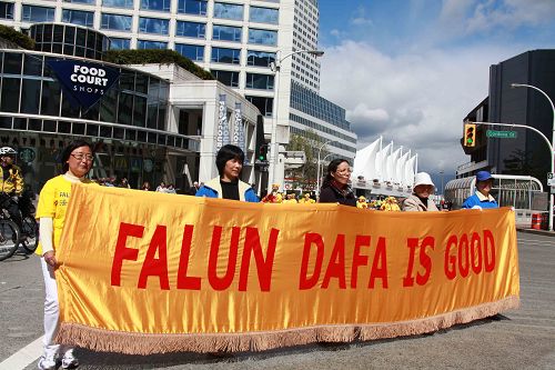 【明慧网二零一五年四月二十八日】(明慧记者张然加拿大温哥华报道)二零一五年四月二十五日,加拿大温哥华法轮功学员在市中艺术馆前举行集会,纪念四•二五和平上访十六周年,并庆祝超过二亿中国民众三退(退党、退团、退队)。集会后,法轮功学员从温哥华市中心开始游行,途经市中心著名景点五帆酒店,然后继续游行走到唐人街,一路引来行人观看和拍摄。