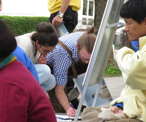 ![]() 图1:德国民众了解法轮功受中共迫害的真相。 |