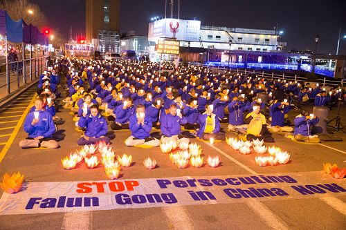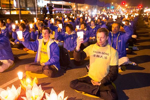 【明慧网二零一五年四月二十八日】(明慧记者采菊纽约报道)二零一五年四月二十五日的傍晚,继白天的游行集会后,约一千多名法轮功学员来到纽约曼哈顿中城的中共驻纽约总领事馆前,集体炼功并在烛光中静坐。纪念十六年前上万名法轮功学员到中共国务院信访办的和平上访,同时谴责十六年来中共对坚持“真善忍”信仰的法轮功学员的残酷迫害