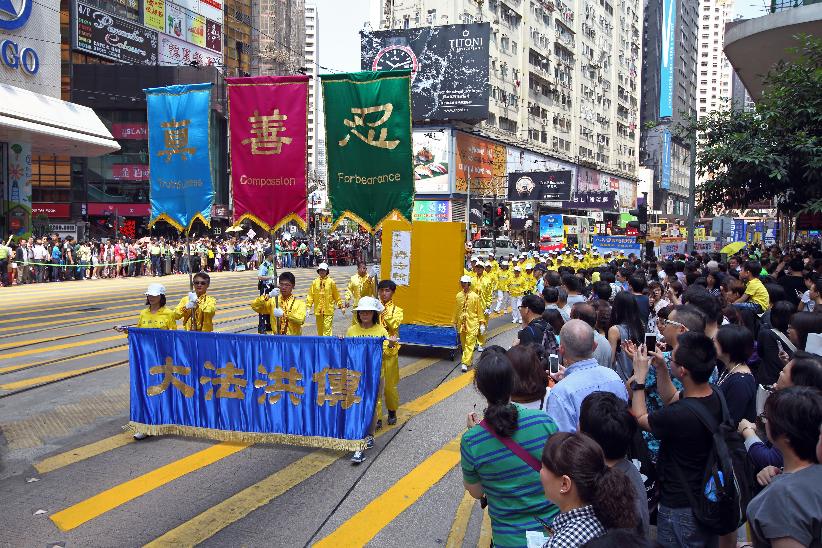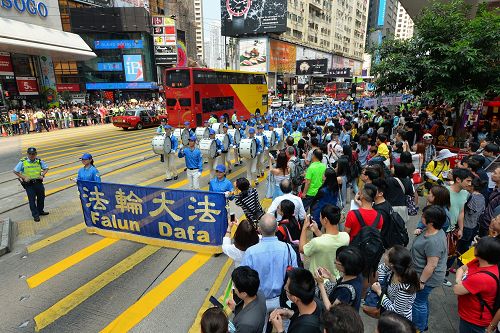 四月二十六日,约八百名法轮功学员从北角英皇道游乐场出发,游行至中环爱丁堡广场,最后在中环爱丁堡集合大炼功,场面平静祥和。当“大法洪传”、“真善忍”、“你退了吗?”、“天要灭中共退党保平安”等幡旗横幅,在香港岛闹市中心呈现,吸引很多大陆游客观看,不少人都感觉震撼。