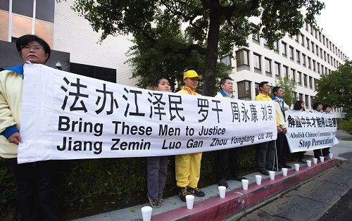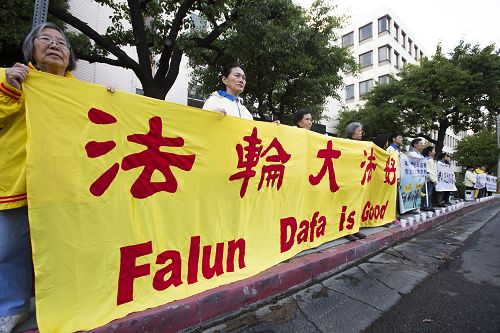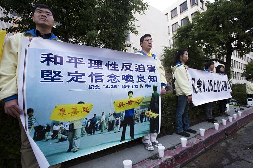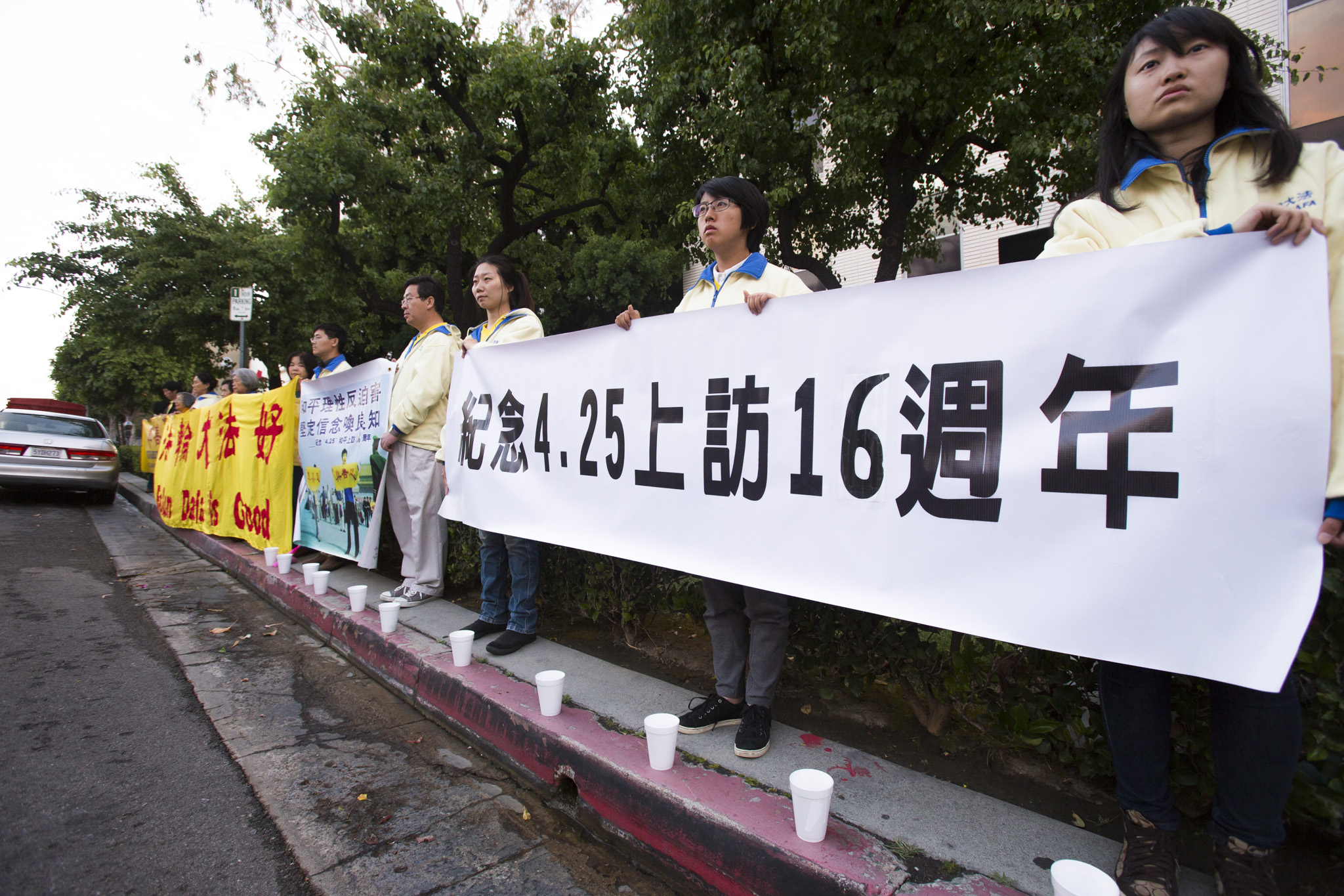 ![]() 图:数百名法轮功学员聚集在洛杉矶中领馆前,烛光纪念十六年前的这一天。 |