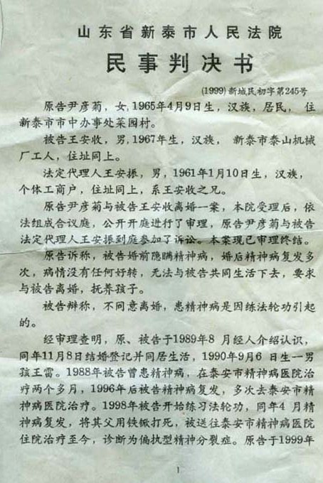 事实上,新泰市泰山机械厂工人王安收,是一个精神病患者,因精神病发作将其父亲用铁锨打死。这一点,在当地法院判决王与妻子尹彦菊离婚的判决书上写得非常明白。新泰市法院(1999)新城民初字第245号民事判决书指出:“本院认为,被告(王安收)婚前患精神病并隐瞒,婚后精神病多次复发,且经久治不愈,曾因精神病发作杀害自己的父亲,原告(尹彦菊)坚决要求离婚,夫妻感情已完全破裂,原告离婚请求予以支持。”可是这个案例经泰安邪党官员、文痞篡改后,被中共江氏集团收进 “1400例”,栽赃到法轮功头上,欺骗毒害了许多人。