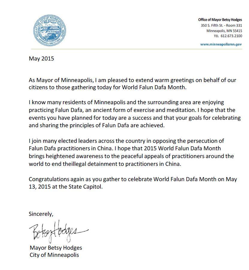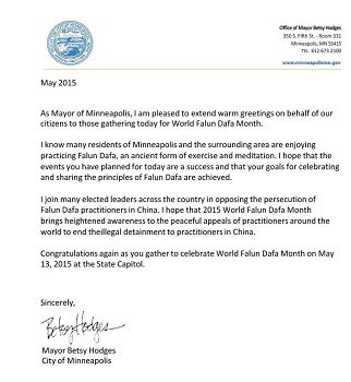 明州第一大城市——明尼阿波利斯市(Minneapolis)市长发来贺信,代表本市的居民向庆祝法轮大法月的民众表示热烈的祝贺。他在信中说:“我知道明尼阿波利斯及周边地区的许多民众喜爱修炼法轮大法——这一古老的健身及修行方法。我祝愿庆祝活动圆满成功,祝愿你们庆祝及分享法轮大法理念的目的圆满达成。”