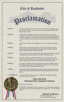 明州第三大城市罗切斯特市(Rochester)市长颁发褒奖,赞扬法轮大法给人们带来的健康和道德水平的提高,谴责中共对法轮大法的迫害,并宣布法轮大法周。褒奖译文如下: