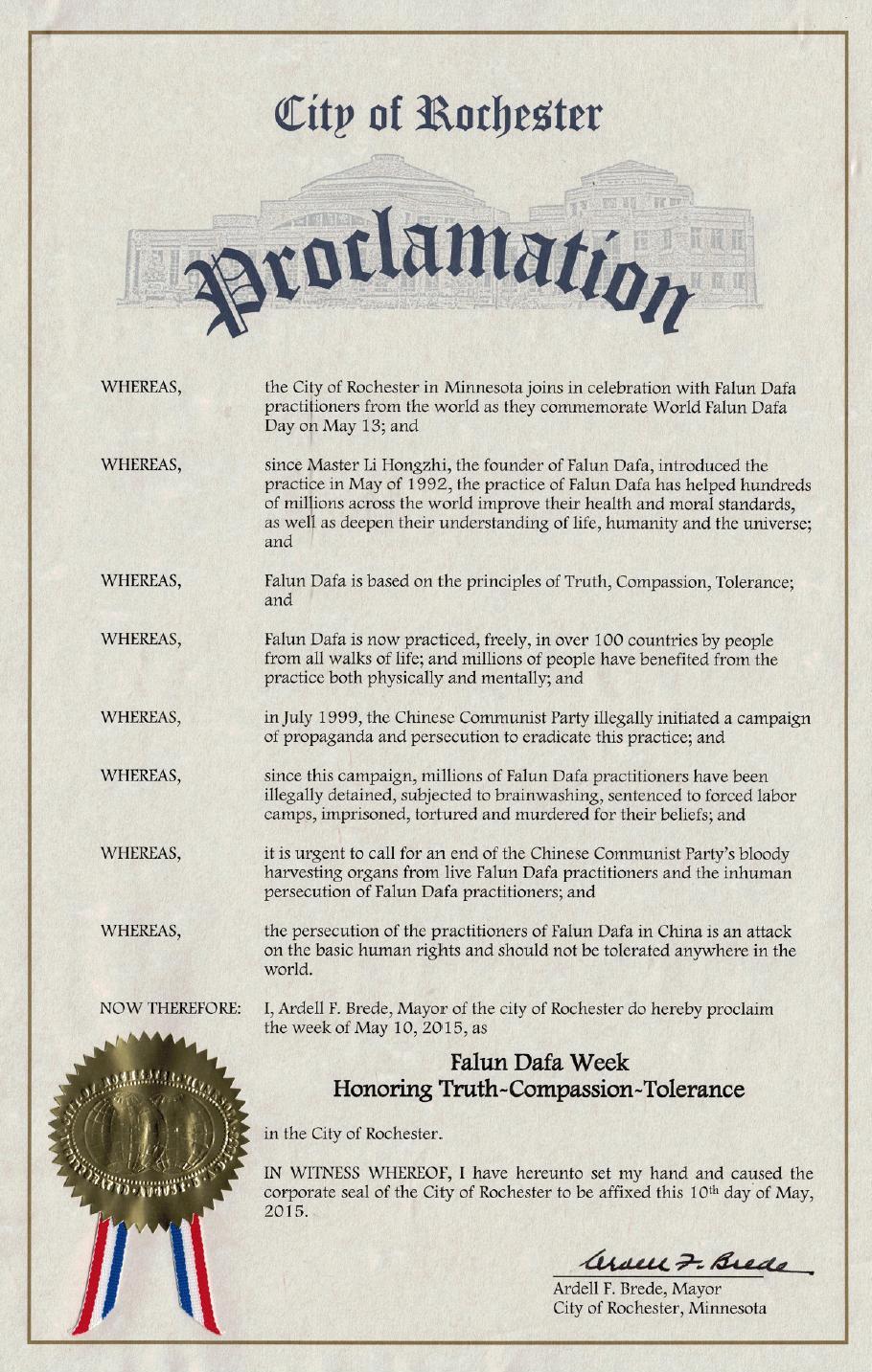 因此,现在,我,阿戴尔•布雷迪,罗切斯特市市长,为褒奖真善忍,宣布二零一五年五月十日这一周,为罗切斯特市市的法轮大法周。