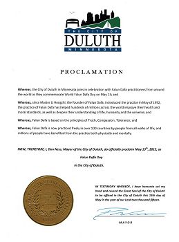 明州第五大城市迪庐斯市(Duluth)市长也颁发褒奖,宣布二零一五年五月十三日为迪庐斯市的法轮大法日。褒奖译文如下: