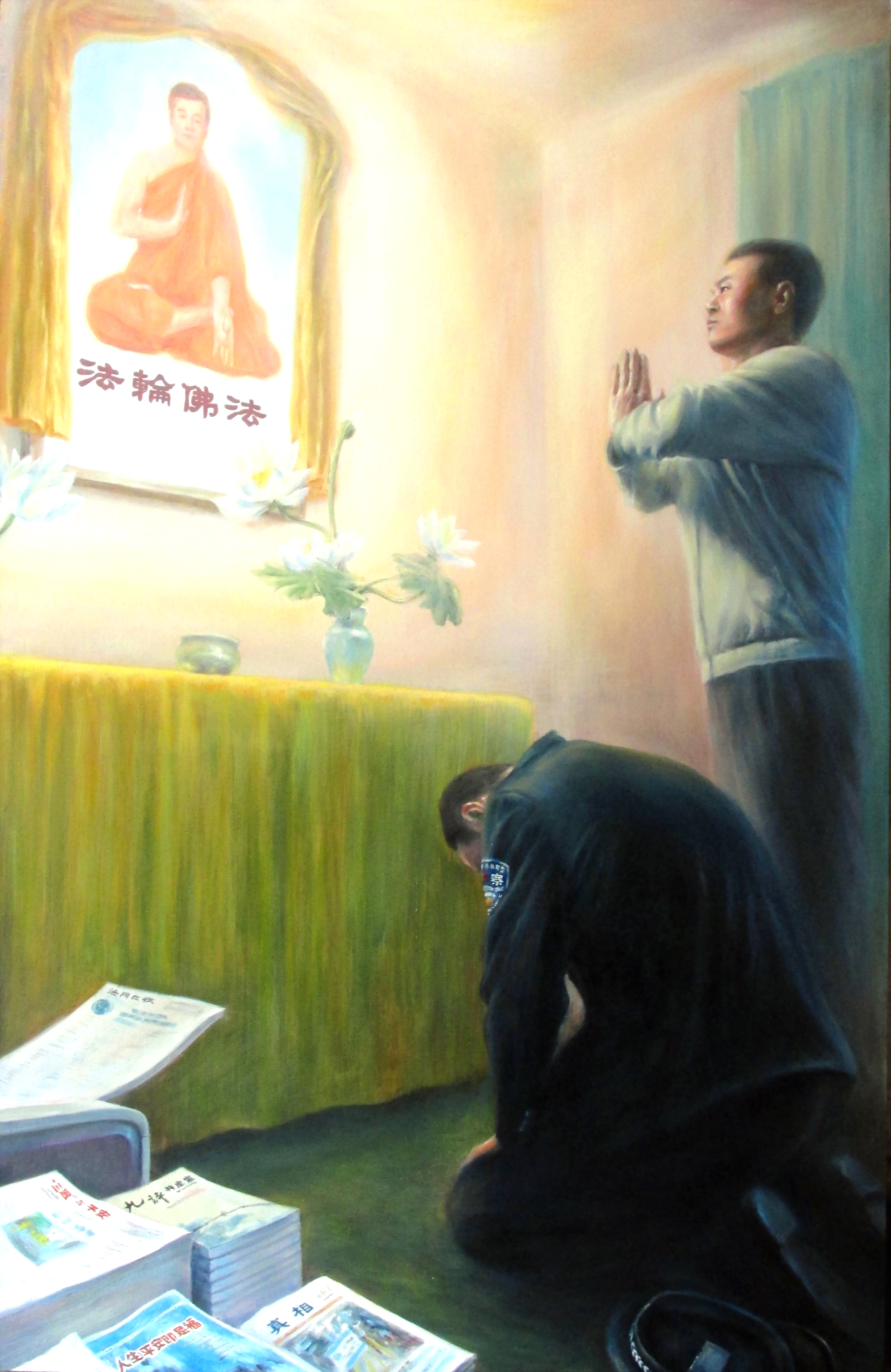这是发生在本地区的一个真实的事情,一天区市610头子伙同当地610头子,公安分局局长及派出所警察等30多人,黑云压顶般扑向当地法轮功真相资料点——即大法弟子老郑(化名)家,企图抄家绑架,老郑正念抵制,并向他们讲述法轮大法的真相,劝告他们放下罪恶选择光明。数小时后,610头子央求老郑,说只进屋看一看,老郑允许610头子一人进入,其他人不许动。进屋后面对大法师尊法像,老郑正告610头子:“这是我们的师父,你现在赎罪还来得及。”610头子当即跪下忏悔道:“李大师啊,我终于有机会向您赎罪”。之后警察全部撤走。