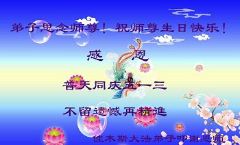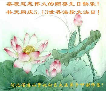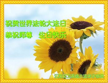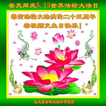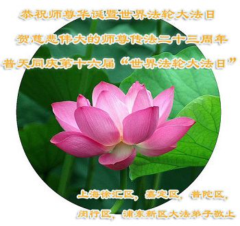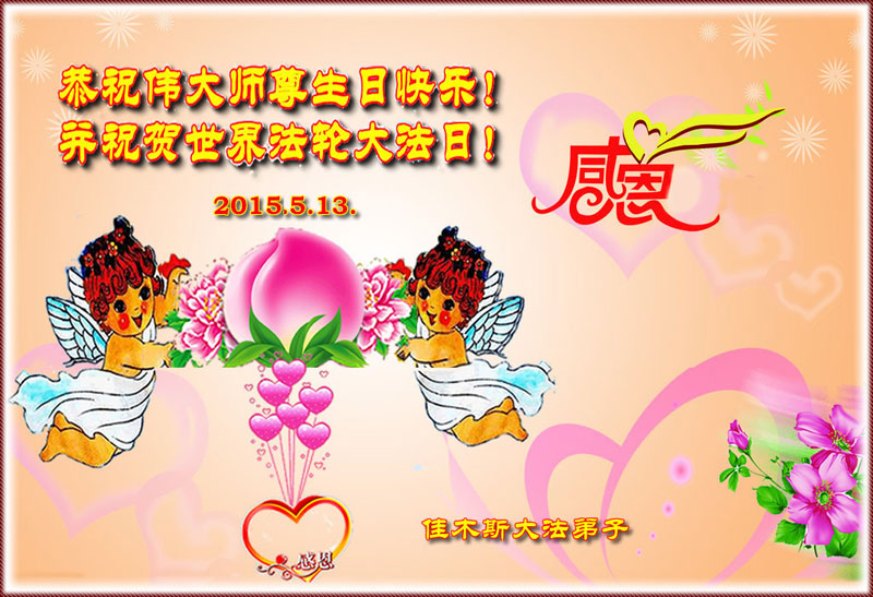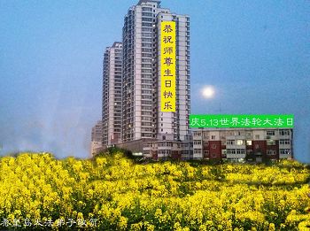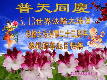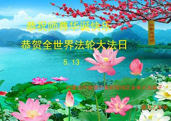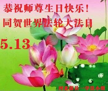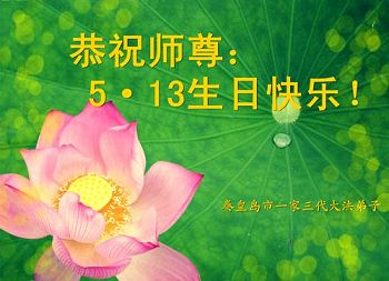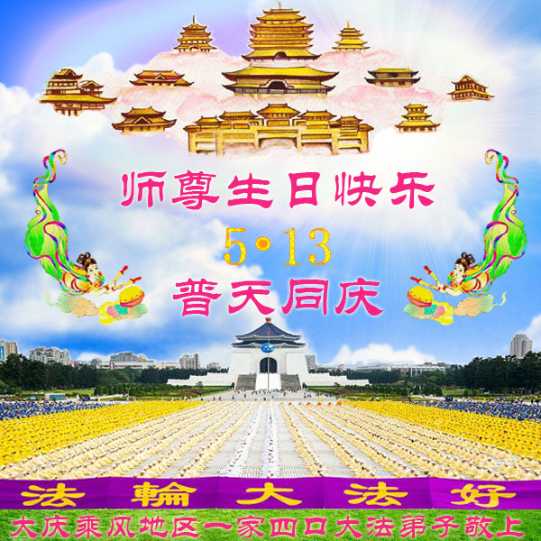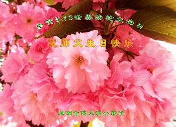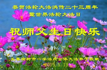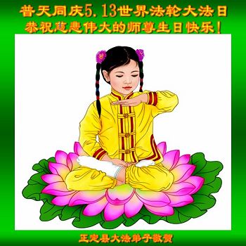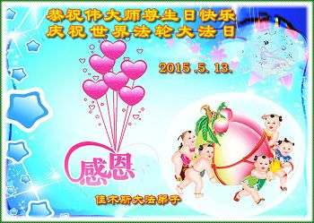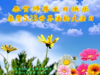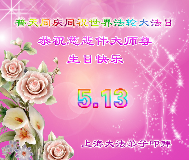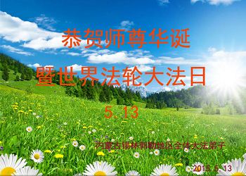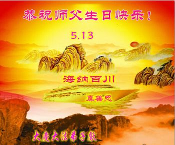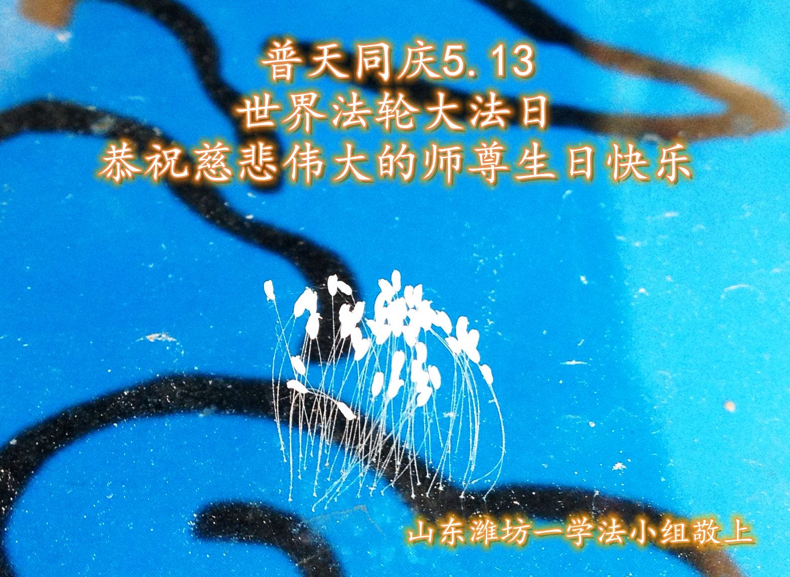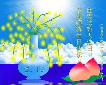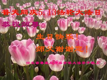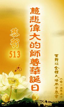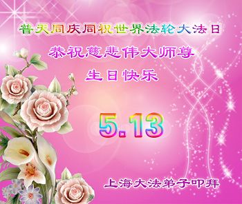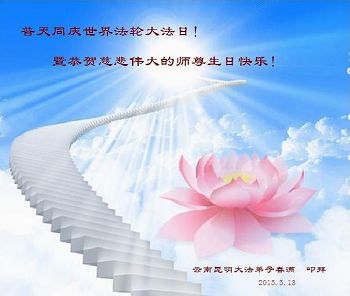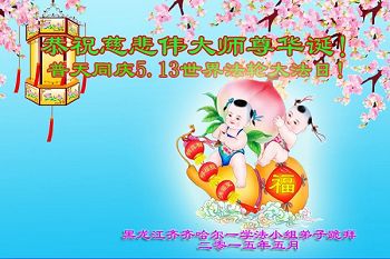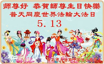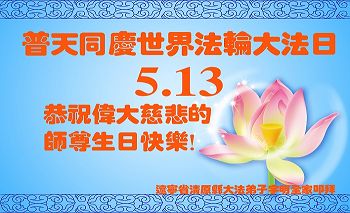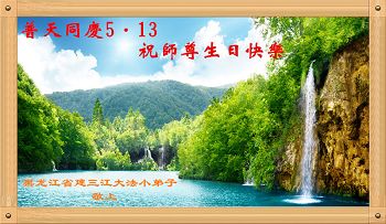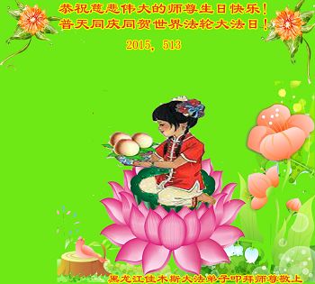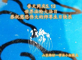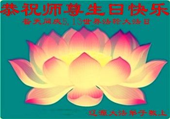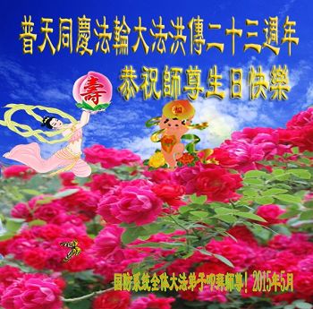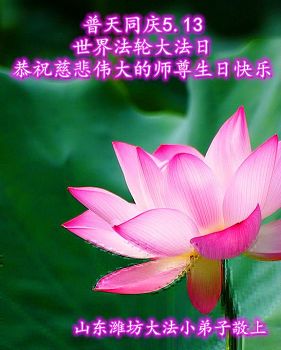 在这普天同庆的日子里,我们与全世界的大法弟子同心欢呼:祝愿慈悲伟大的师尊生日快乐!庆祝五一三世界法轮大法日!此时此刻千言万语难以表达弟子的心情,只能说一句,请师尊放心,弟子一定牢记自己历史的使命,助师正法,救度众生。慈悲伟大的师尊您辛苦了!