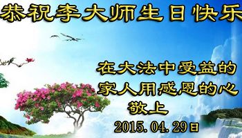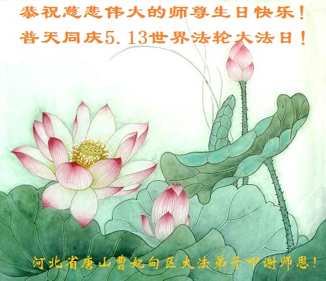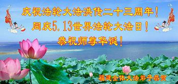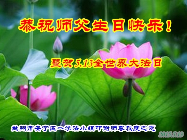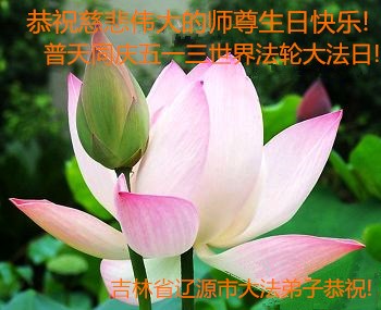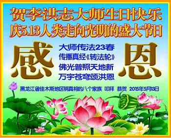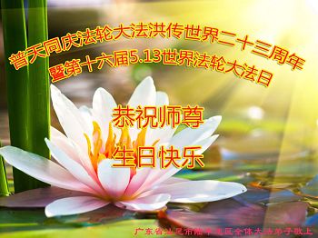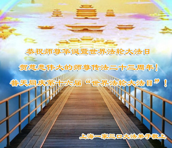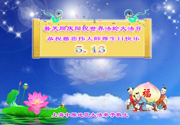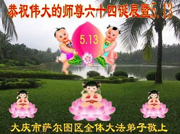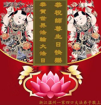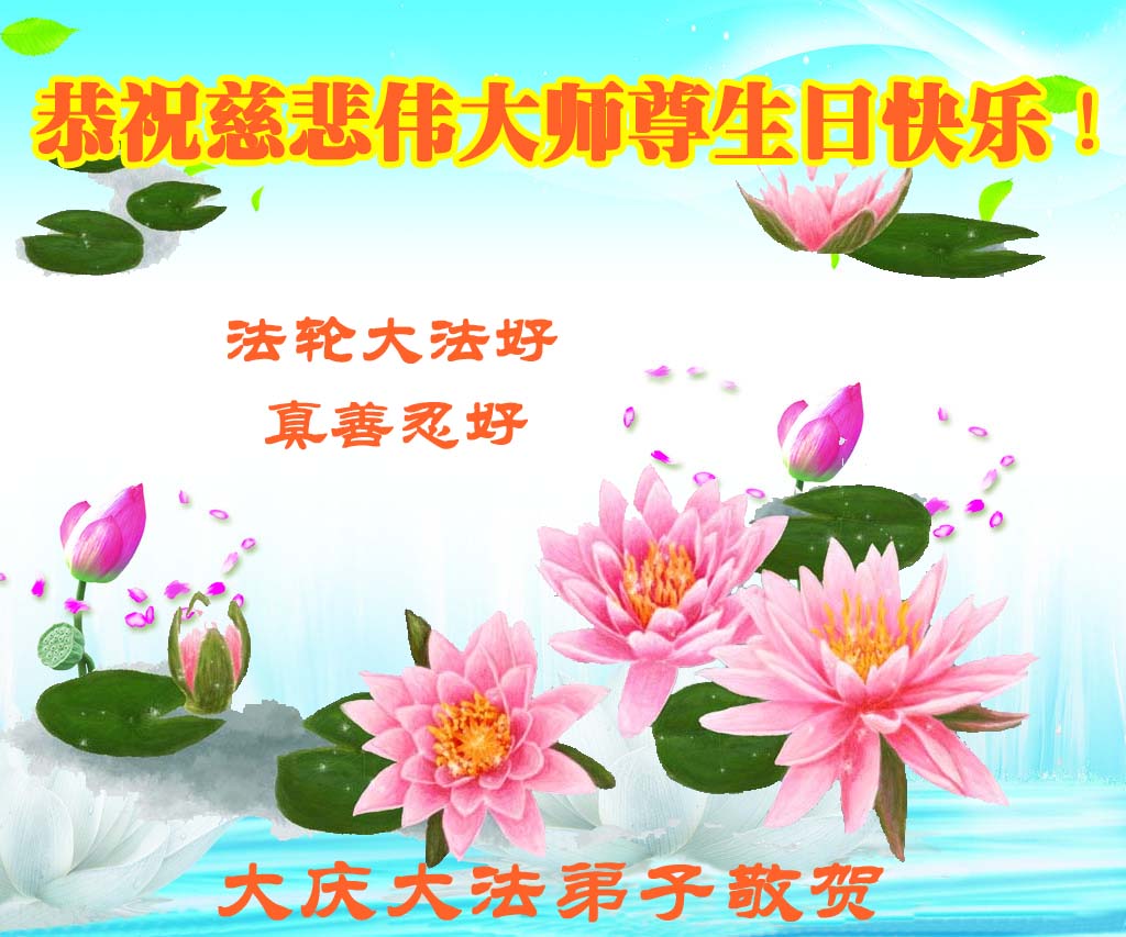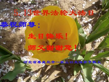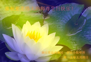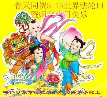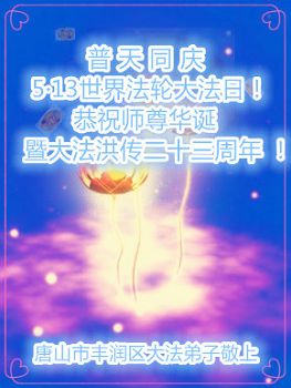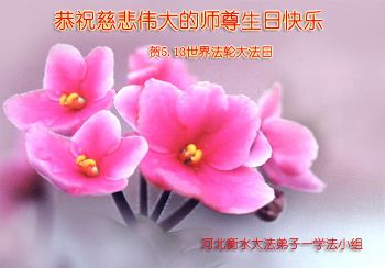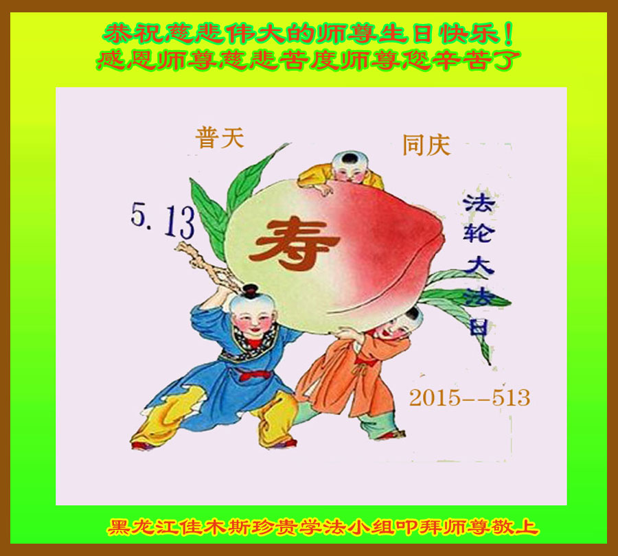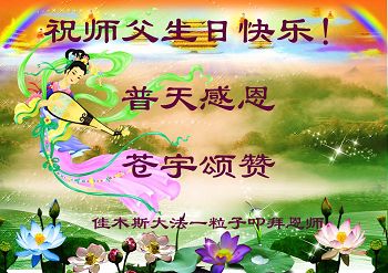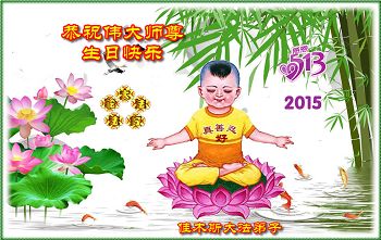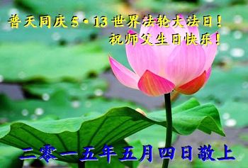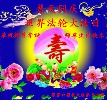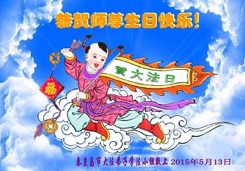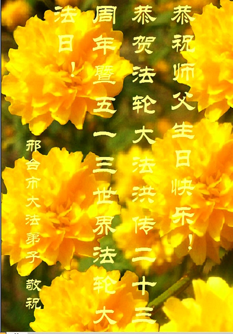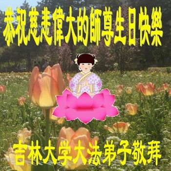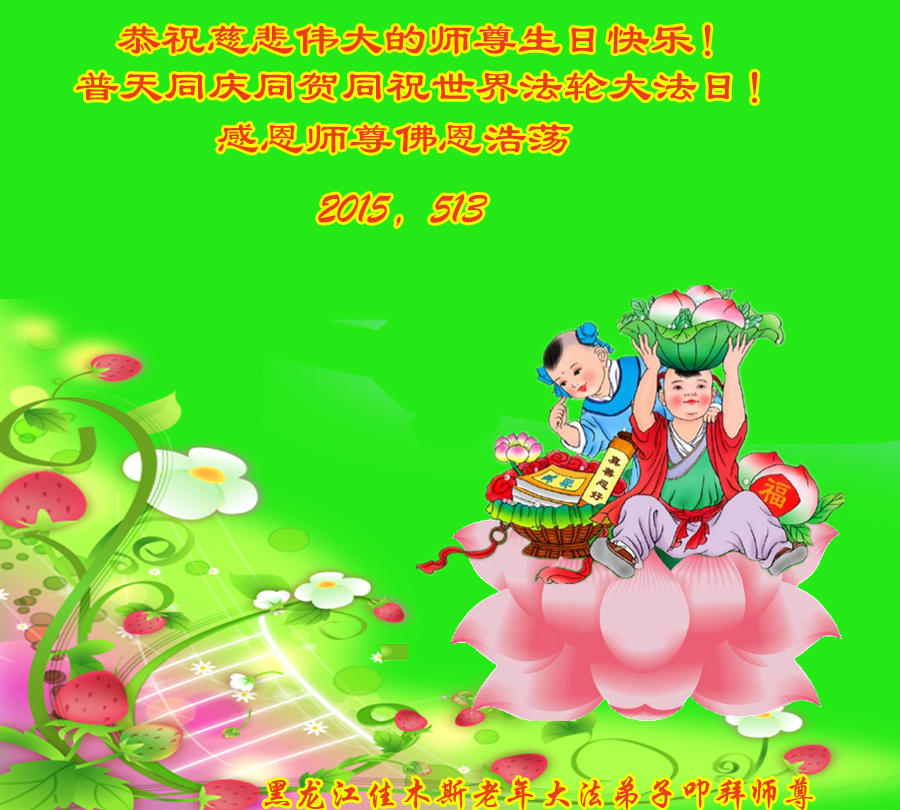 在这普天同庆的日子里,我们与全世界的大法弟子同心欢呼:祝愿慈悲伟大的师尊生日快乐!庆祝五一三世界法轮大法日!此时此刻千言万语难以表达弟子的心情,只能说一句,请师尊放心,弟子一定牢记自己历史的使命,助师正法,救度众生。慈悲伟大的师尊您辛苦了!