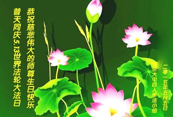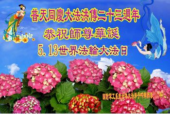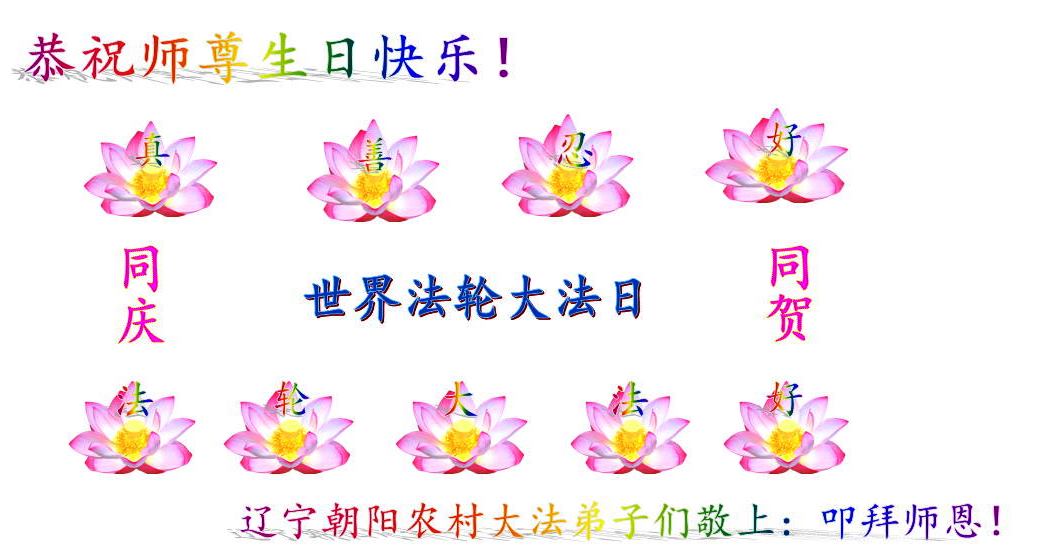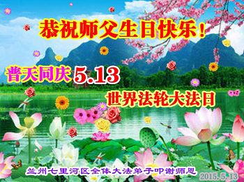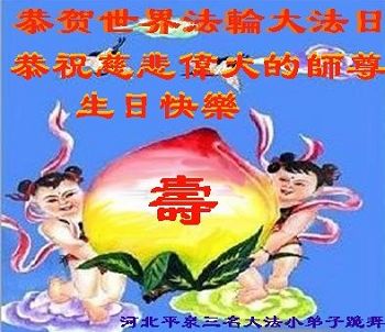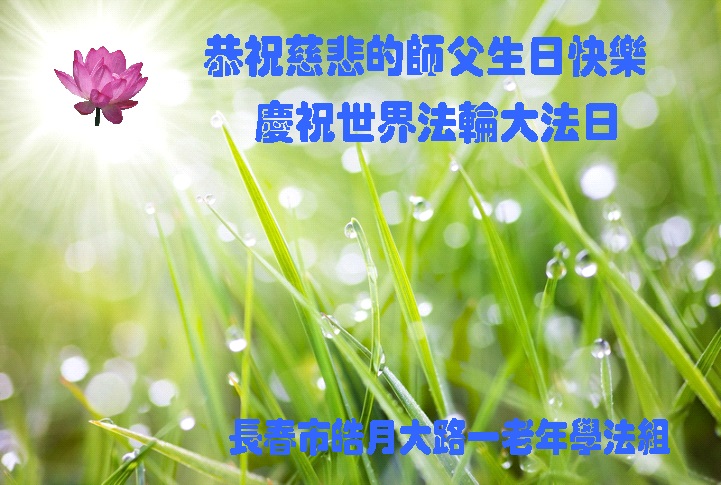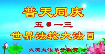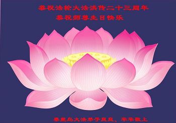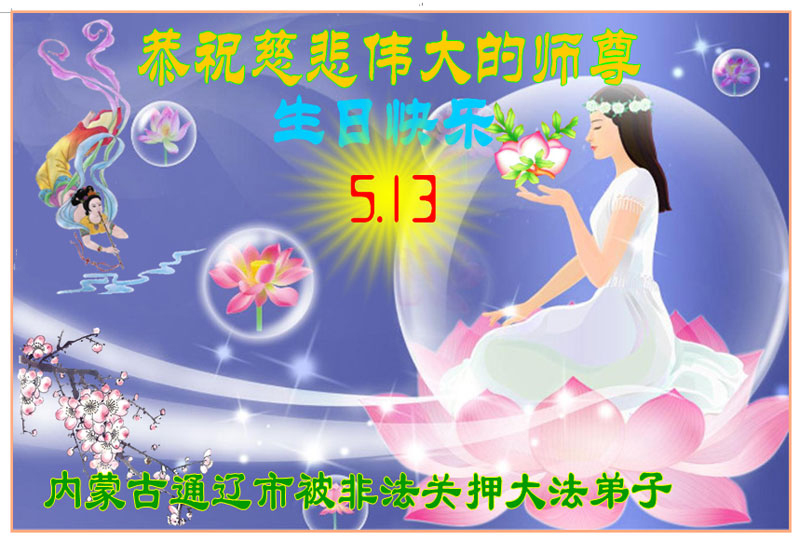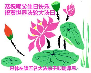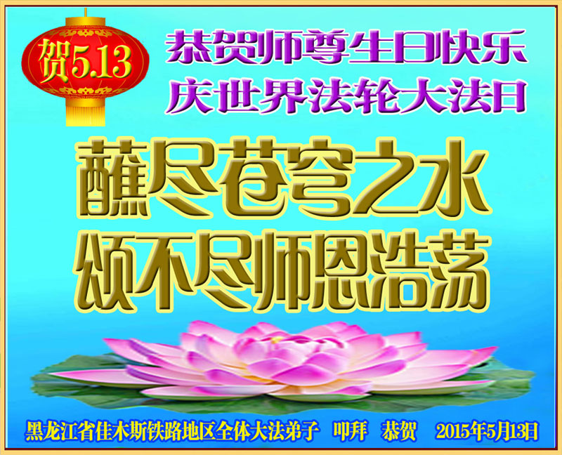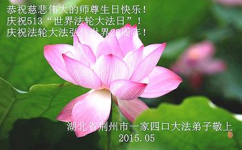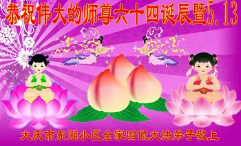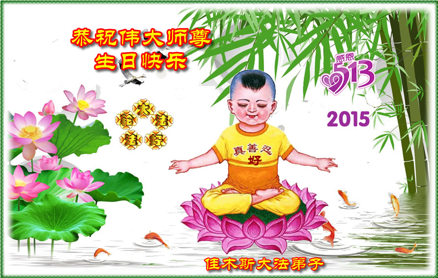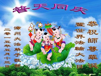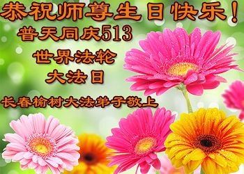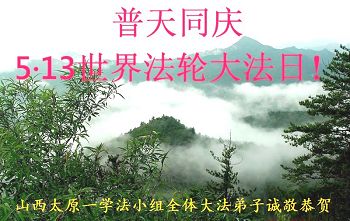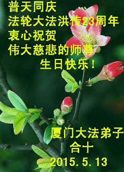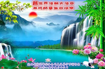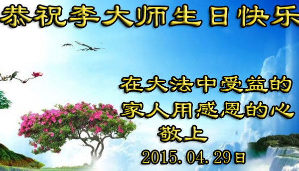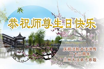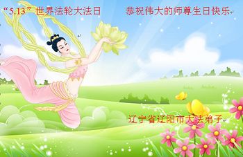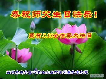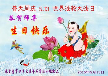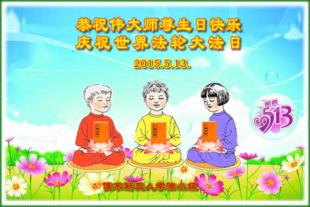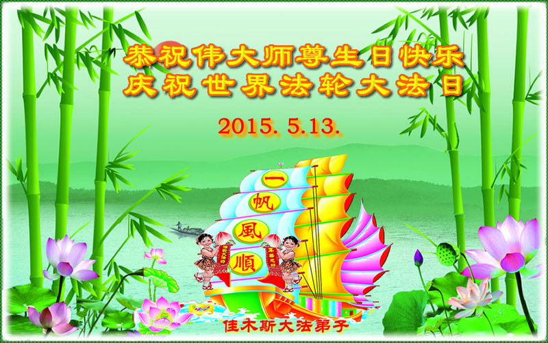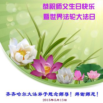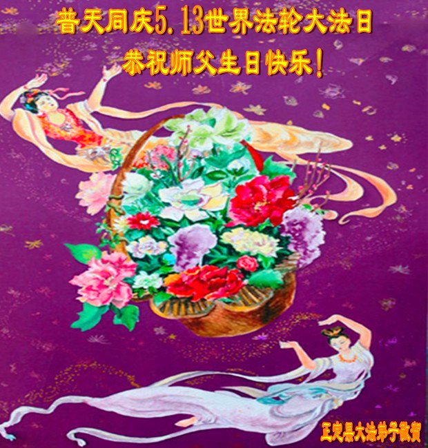 在这普天同庆的日子里,我们与全世界的大法弟子同心欢呼:祝愿慈悲伟大的师尊生日快乐!庆祝五一三世界法轮大法日!此时此刻千言万语难以表达弟子的心情,只能说一句,请师尊放心,弟子一定牢记自己历史的使命,助师正法,救度众生。慈悲伟大的师尊您辛苦了!