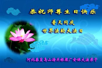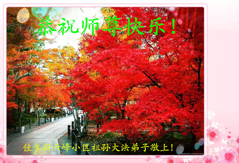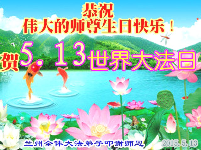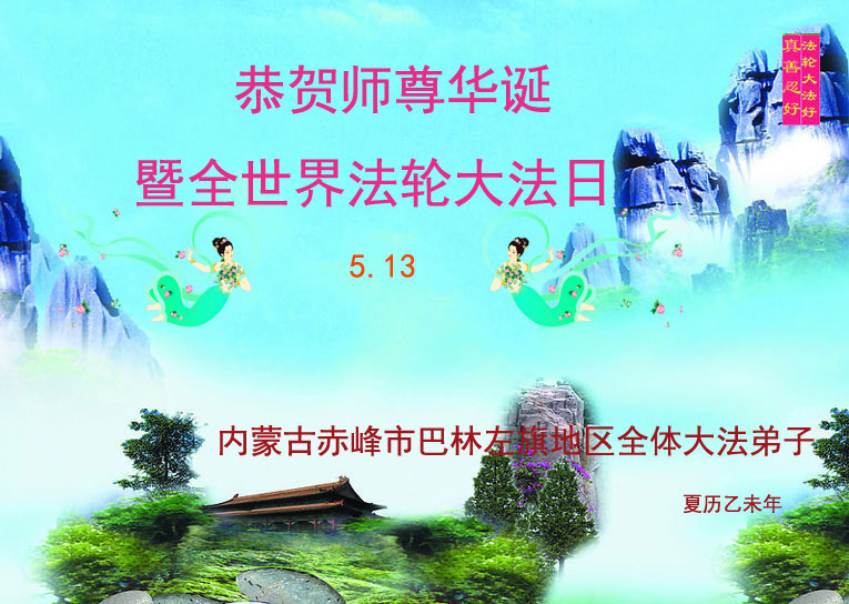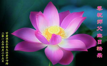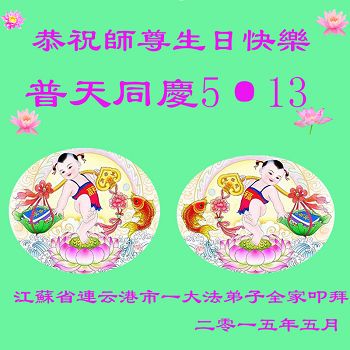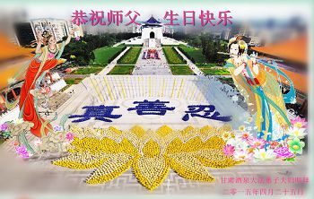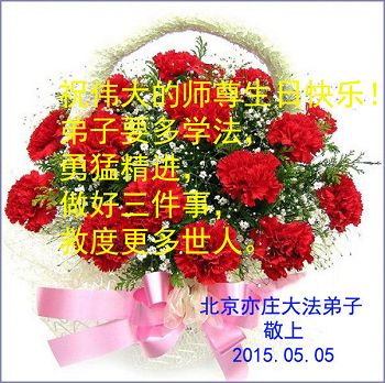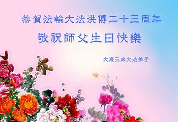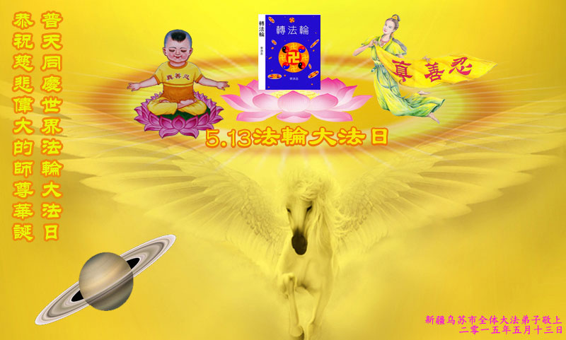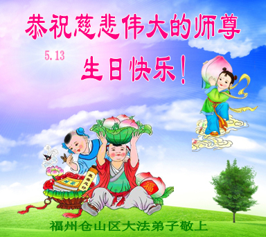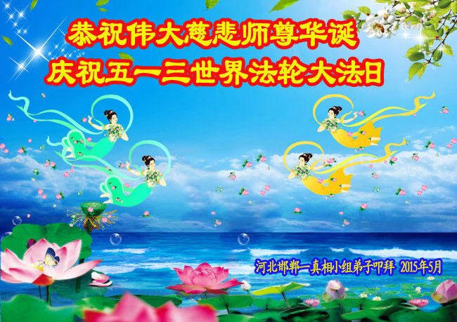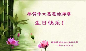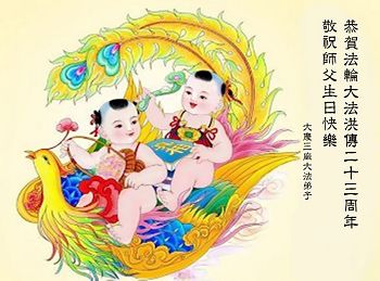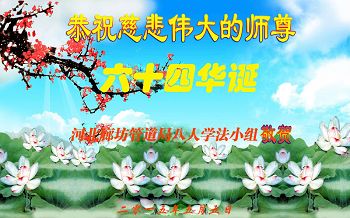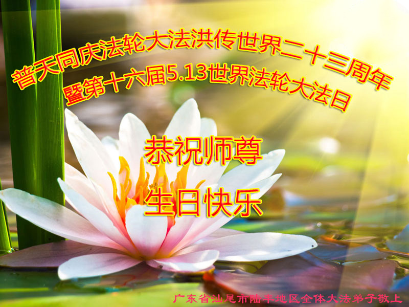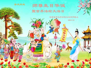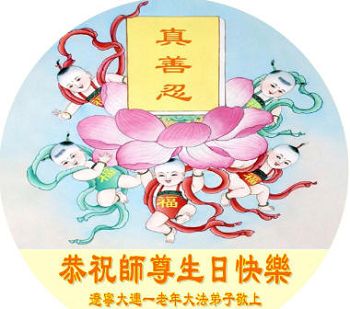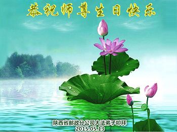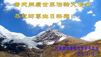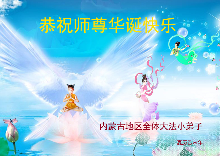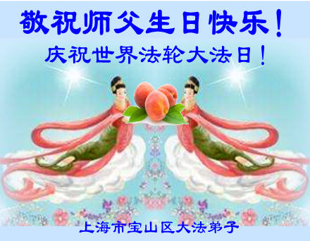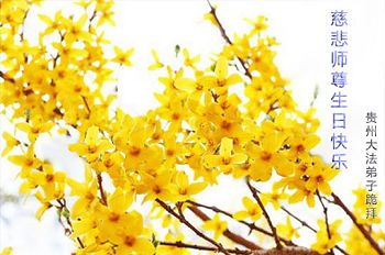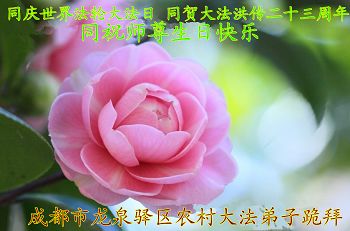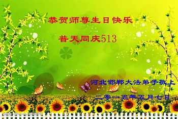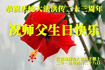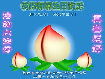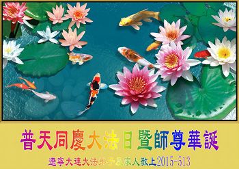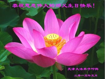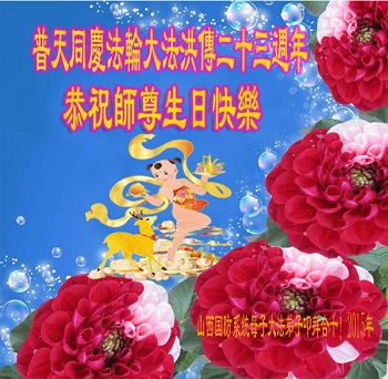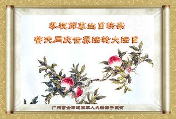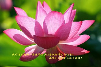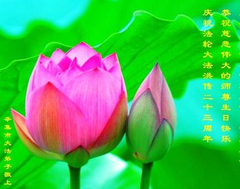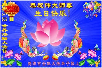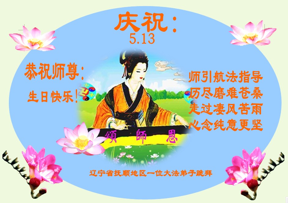 在这普天同庆的日子里,我们与全世界的大法弟子同心欢呼:祝愿慈悲伟大的师尊生日快乐!庆祝五一三世界法轮大法日!此时此刻千言万语难以表达弟子的心情,只能说一句,请师尊放心,弟子一定牢记自己历史的使命,助师正法,救度众生。慈悲伟大的师尊您辛苦了!