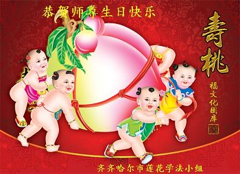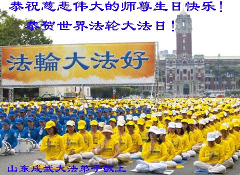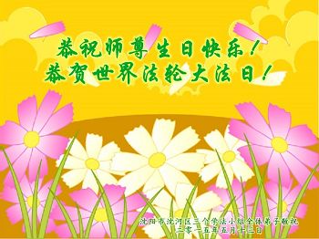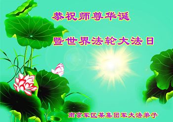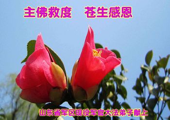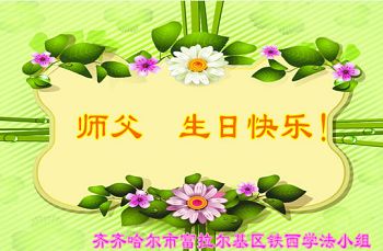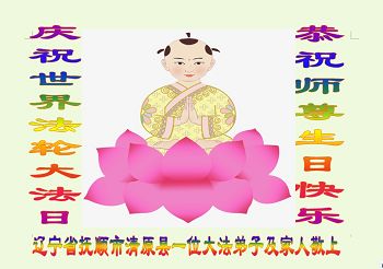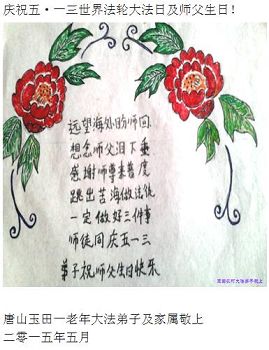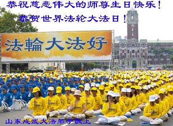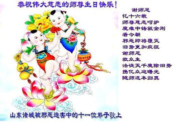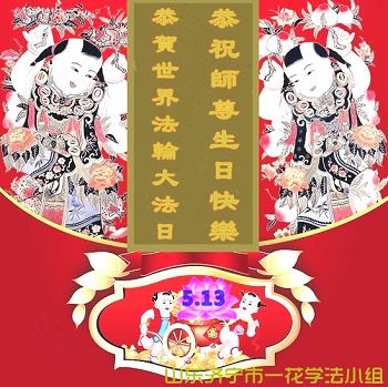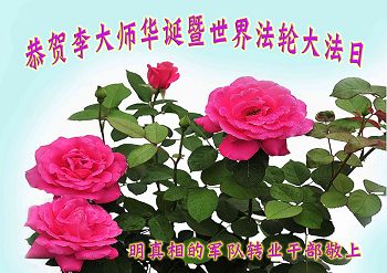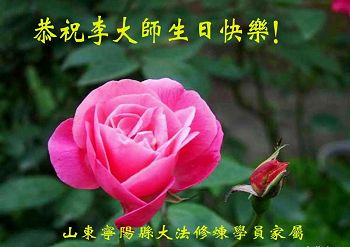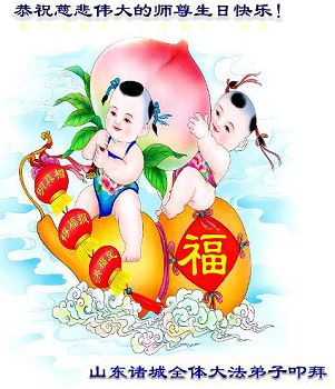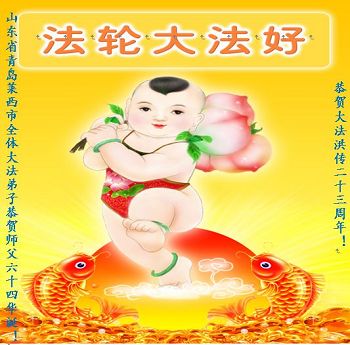 山东烟台开发区大法弟子的老伴部队转业干部早已退出中共邪党,支持法轮功。在普天同庆世界法轮大法日之时,恭祝李大师生日快乐!