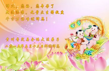 在这普天同庆同颂的神圣节日到来之际,弟子首先跪拜师尊,感恩师尊对众苍生的洪恩救度、对弟子的慈悲苦度。跟随师尊助师正法,救度众生,是弟子的使命。弟子一定珍惜机缘修好自己,用心救人,完成自己的史前大愿,跟师尊回家。