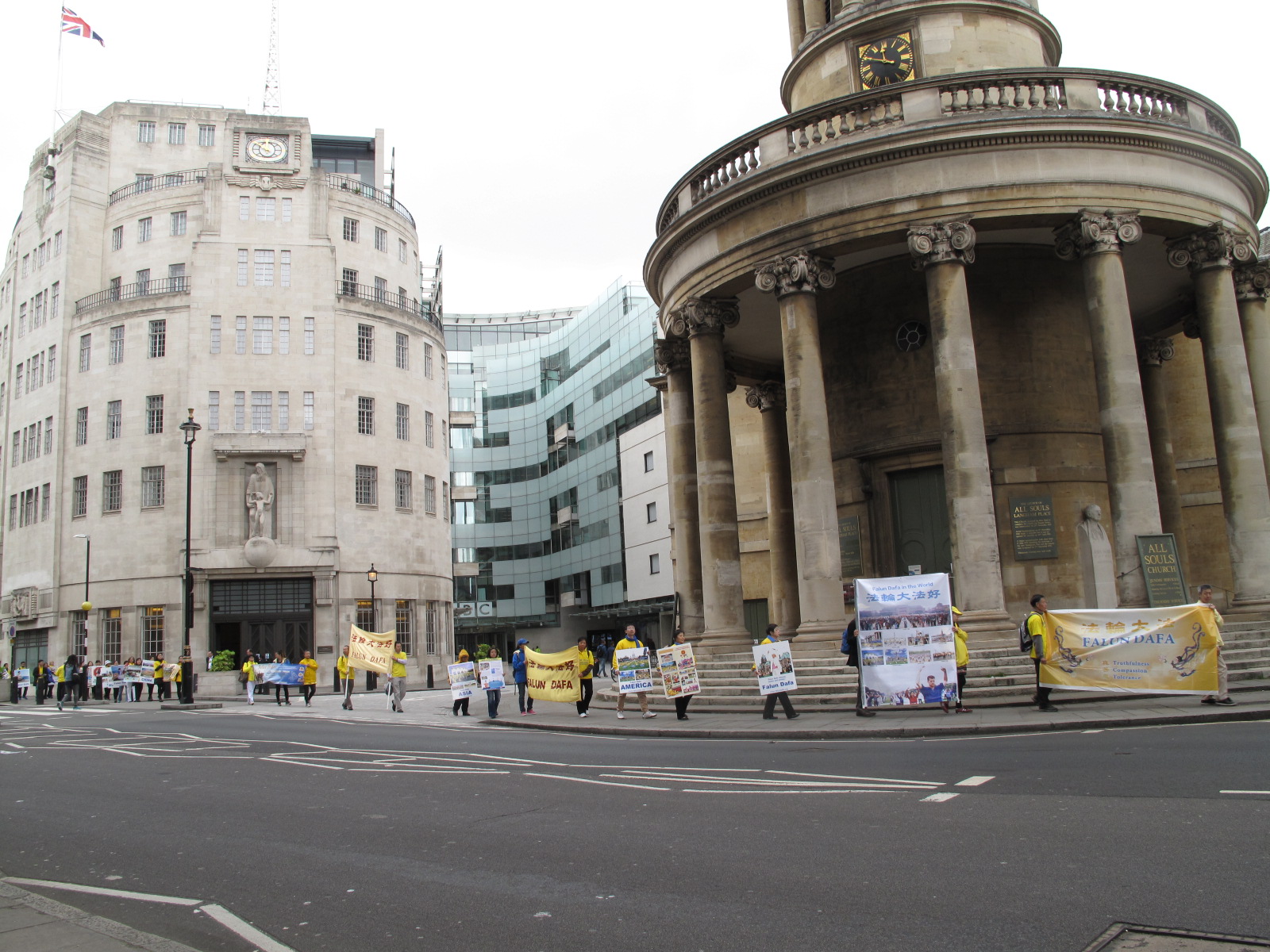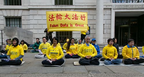 当天,法轮功学员从早晨十点开始在中共驻英使馆前集体炼功,和平反迫害。英国法轮功学员在中使馆前的和平抗议活动对过往行人和行车司机来讲并不陌生,因为他们自发组织的要求中共停止迫害的二十四小时和平抗议已坚持了近十三年。
