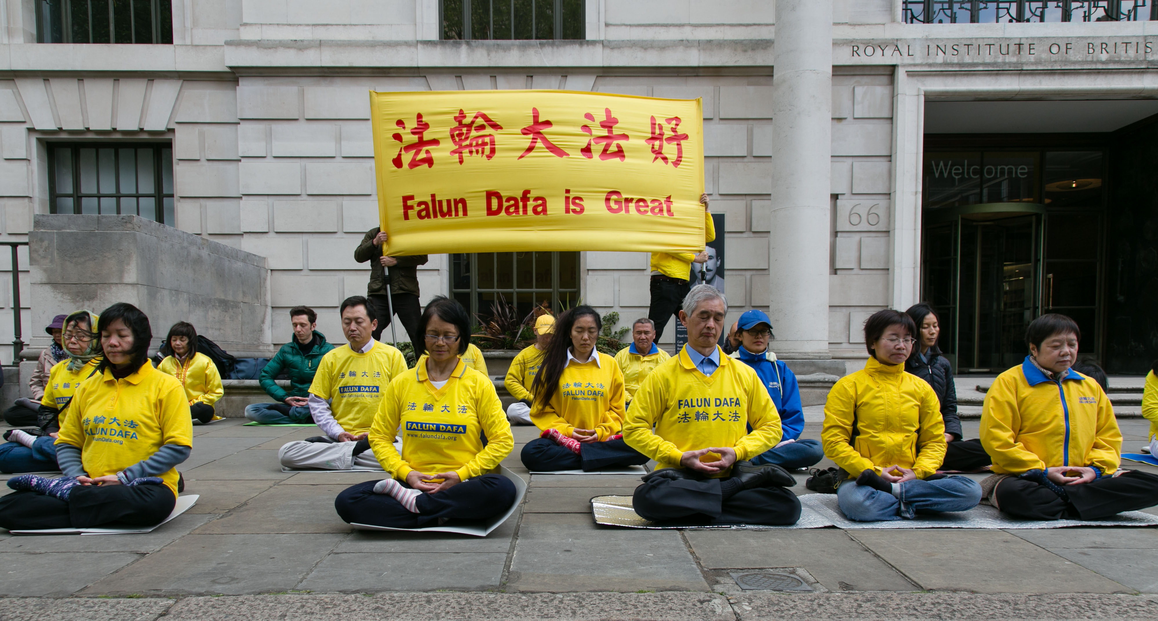 图1-2:二零一五年五月九日,庆祝“世界法轮大法日”的英国法轮功学员在伦敦中使馆前集体炼功、和平反迫害