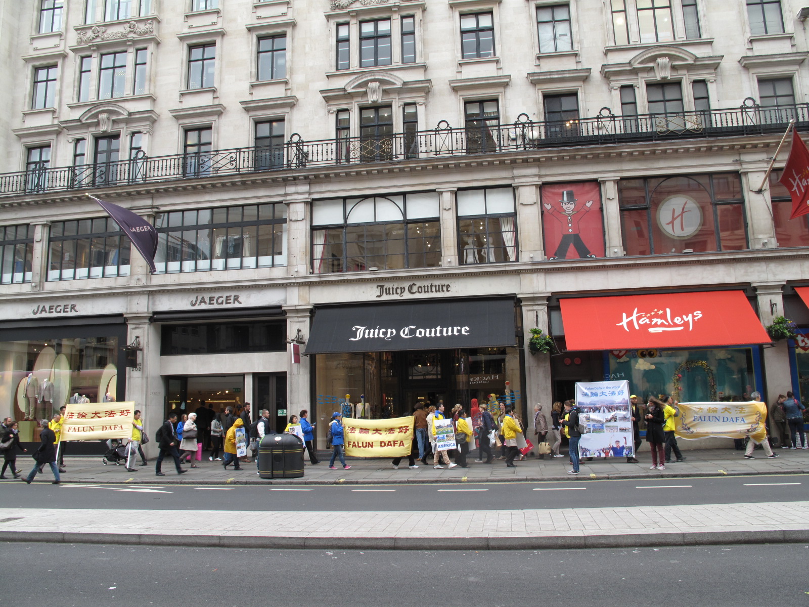 十一点三刻,法轮功学员排成队伍,举起真相横幅和展板,从中使馆前长期坚持和平抗议讲真相的场地出发,在庄严殊胜的«普度»音乐伴随下,沿着摄政街、皮卡迪利大街等位于伦敦市中心的著名商业街的人行道前行。中英文书写的横幅和标语传达着法轮功的基本真相:“法轮大法——真善忍”、“法轮大法好”、“法轮大法,佛光普照,礼义圆明”、“法轮大法洪传世界”、“(中共对法轮功)系统性酷刑迫害和群体灭绝”、“(中共)盗卖器官牟利”、“停止迫害法轮功”、“制止中共活摘器官”、“SOS:英国居民营救正在中国遭受迫害的姐姐”、“解体中共,制止迫害”、“没有共产党才有新中国”、“天灭中共,天佑中华”、等。