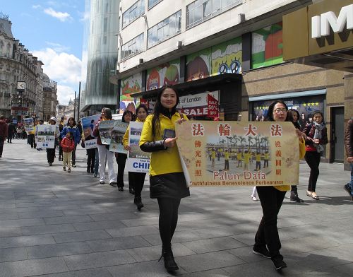 在伦敦市中心繁华大街上游行、传播法轮功真相