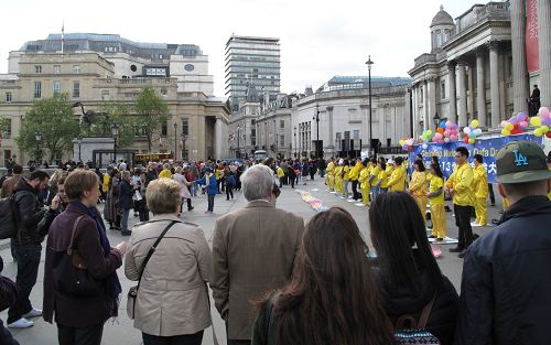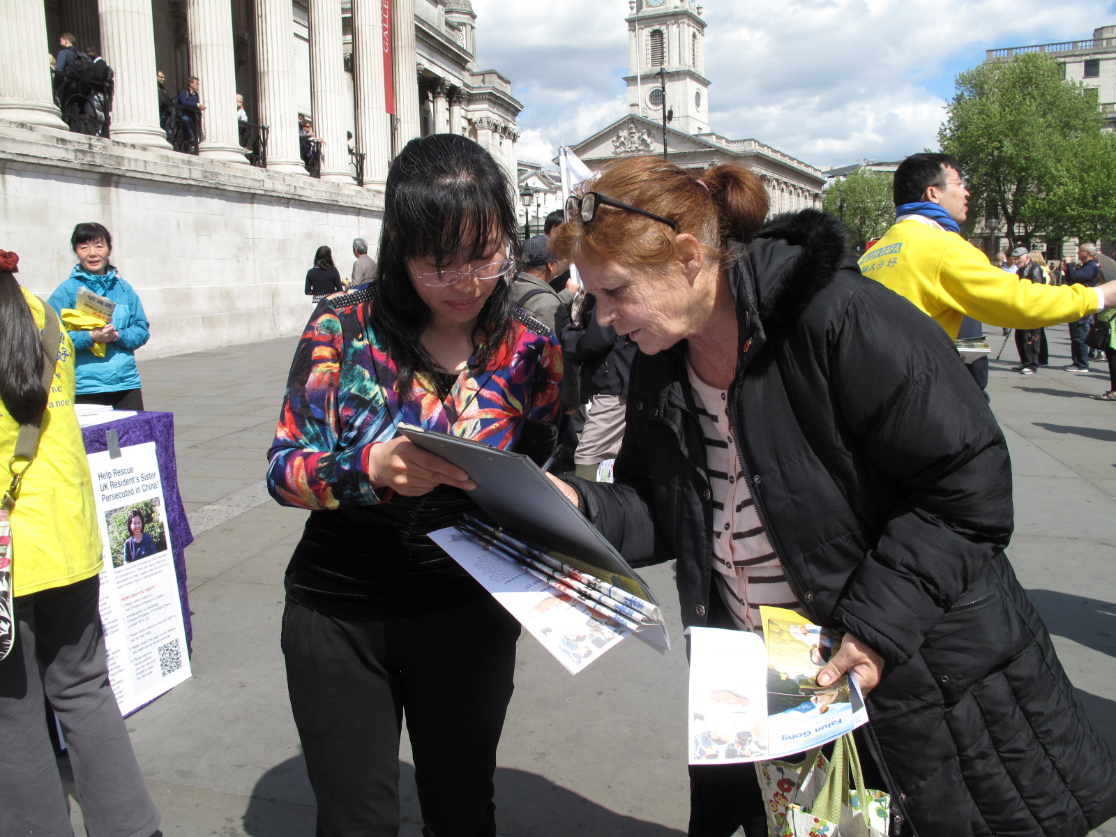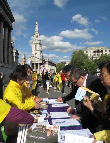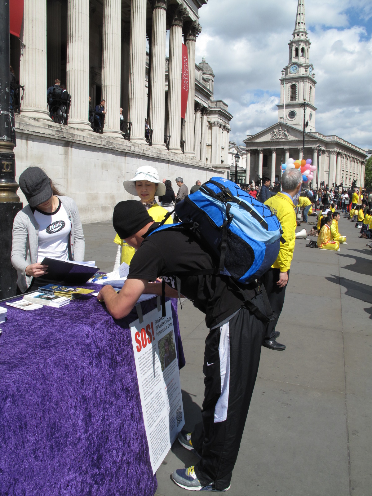 五月九日下午,伦敦迎来了今年入春以来的最好天气,艳阳高照,特拉法加广场一带变得熙熙攘攘。庆祝“世界法轮大法日”的活动吸引了众多民众了解法轮功真相,这些与法轮功学员相遇的有缘人来自世界各地。多位有缘人看到祥和美好的法轮功功法展示后当场就跟着模仿炼习起来,其中一个在活动现场模仿炼功近两个小时。更多的人们在了解真相后纷纷签名反迫害、谴责中共活摘器官罪行。