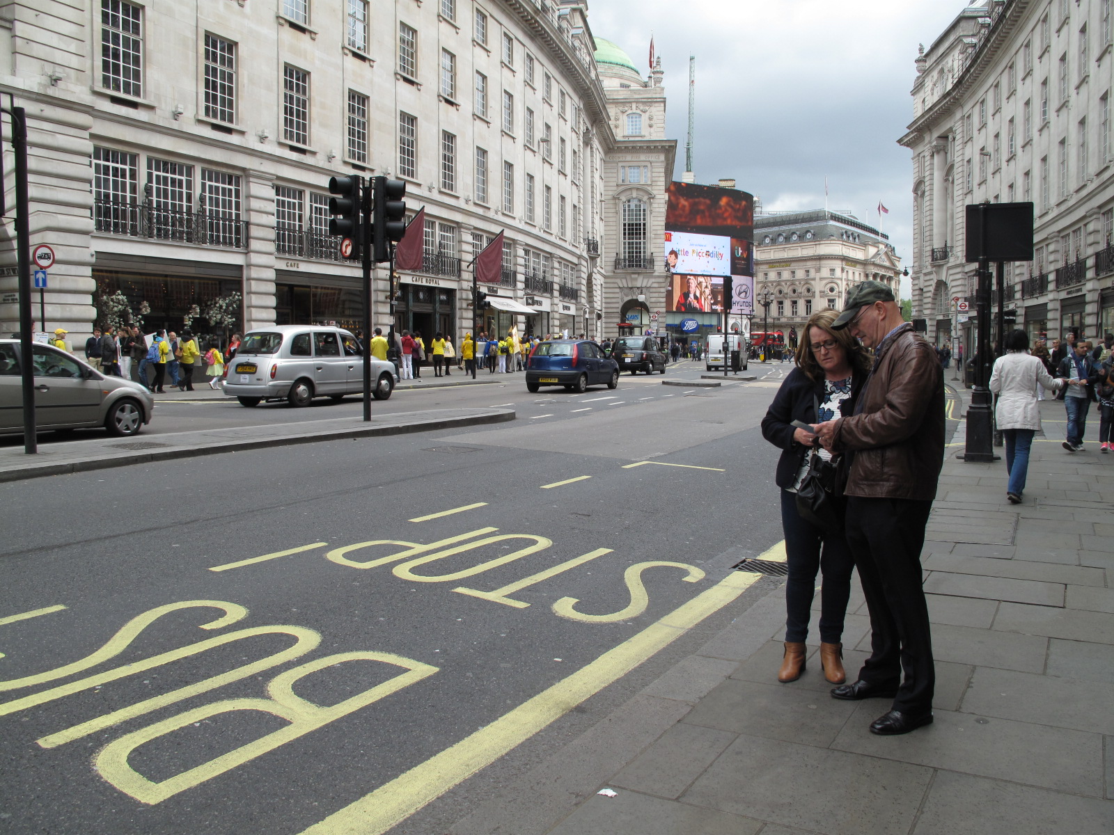 图8:从诺丁汉郡来伦敦探亲的汤姆普森和芭芭拉夫妇在皮卡迪利大街上看到法轮功游行队伍,接过真相传单认真阅读起来