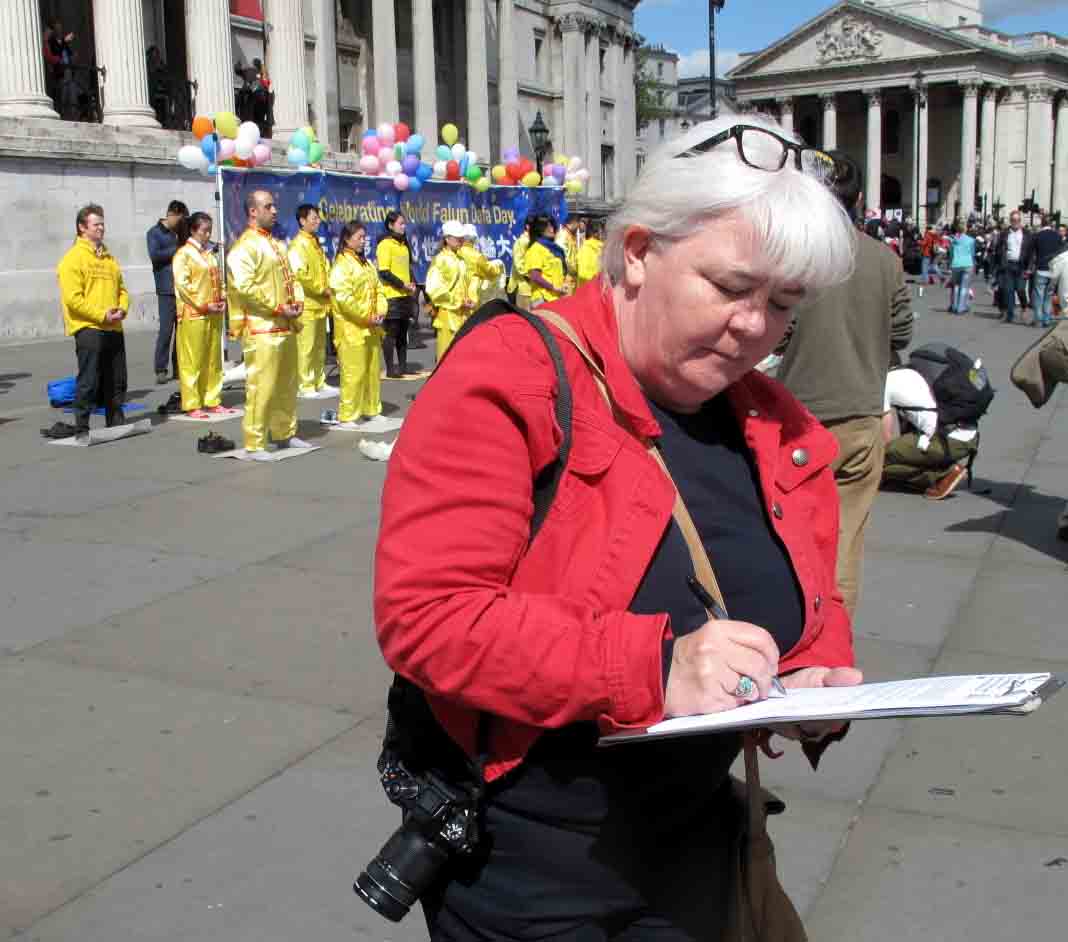 布瑞吉斯(Briges)女士来自北伦敦,二零一五年五月九日下午在特拉法加广场遇到法轮功学员庆祝“世界法轮大法日”活动,当场立即学炼功法,并签名反迫害。