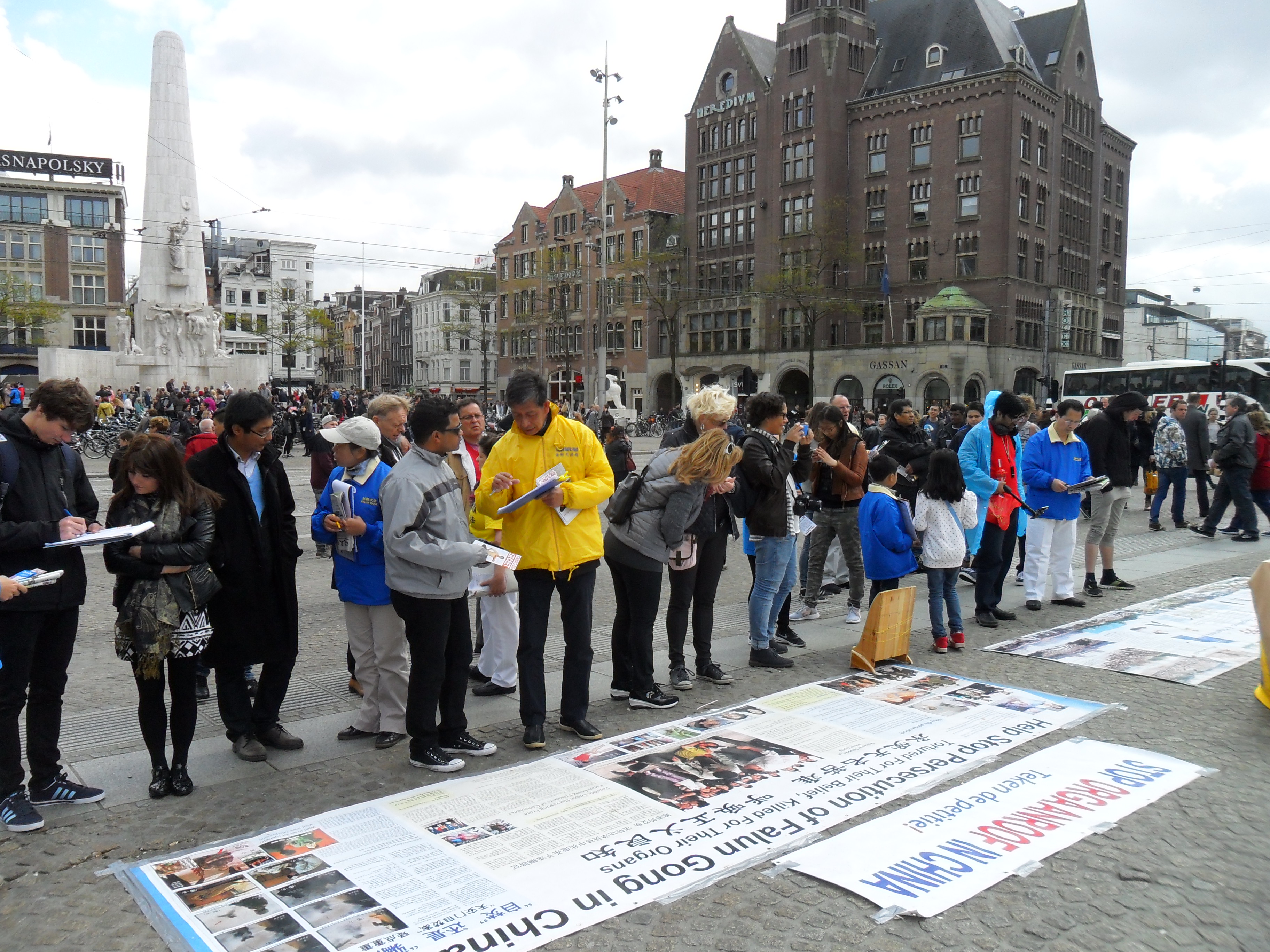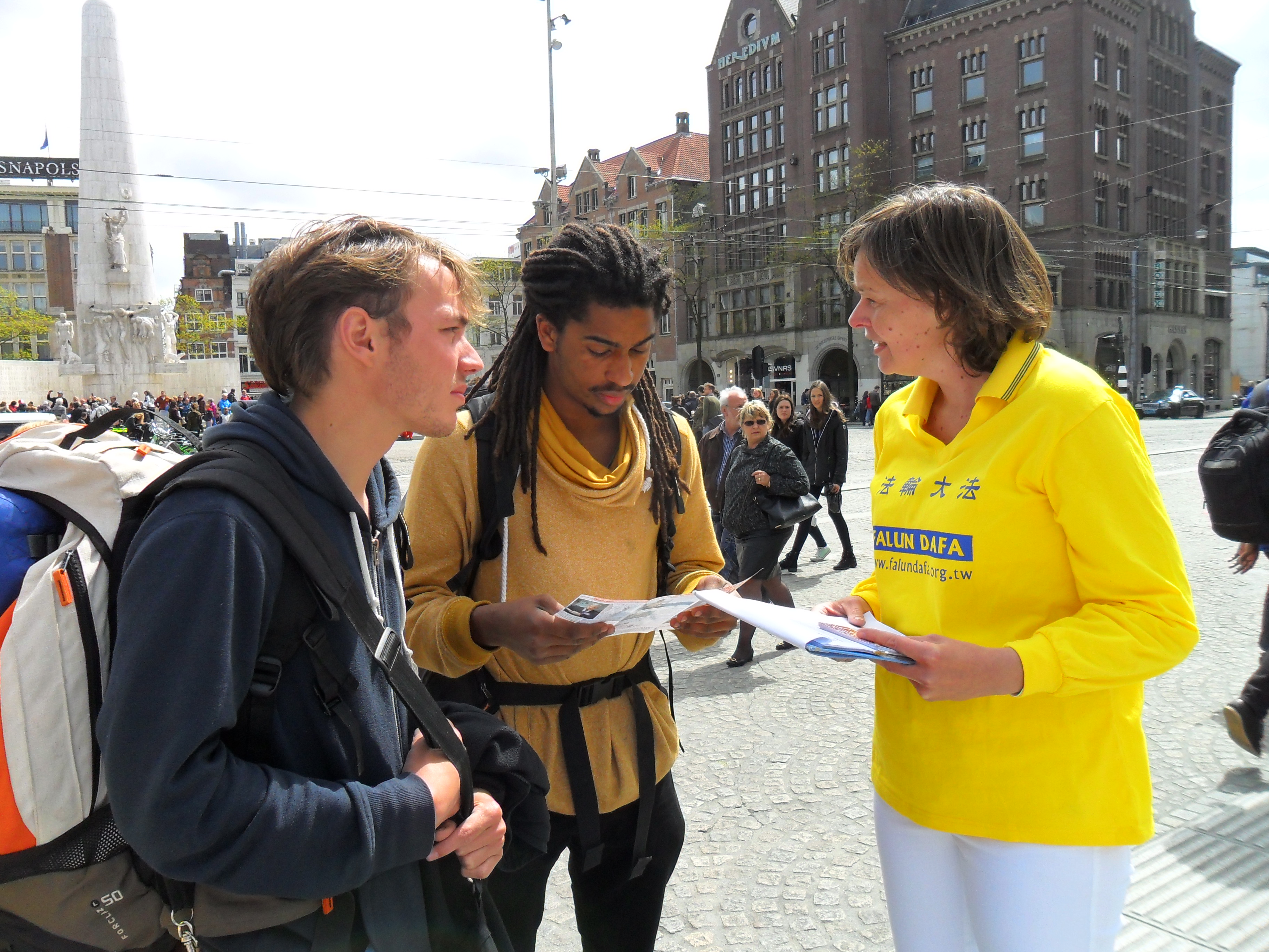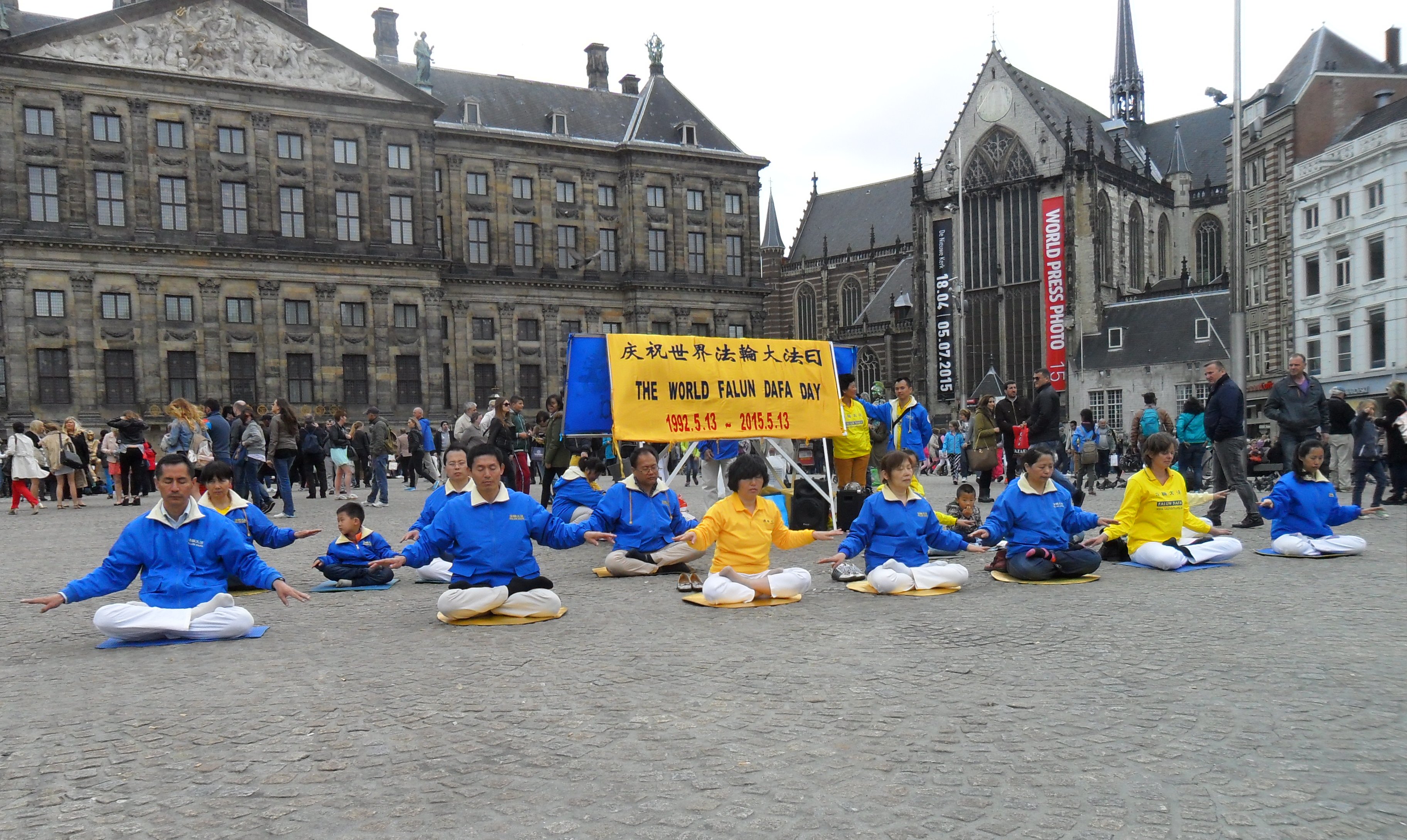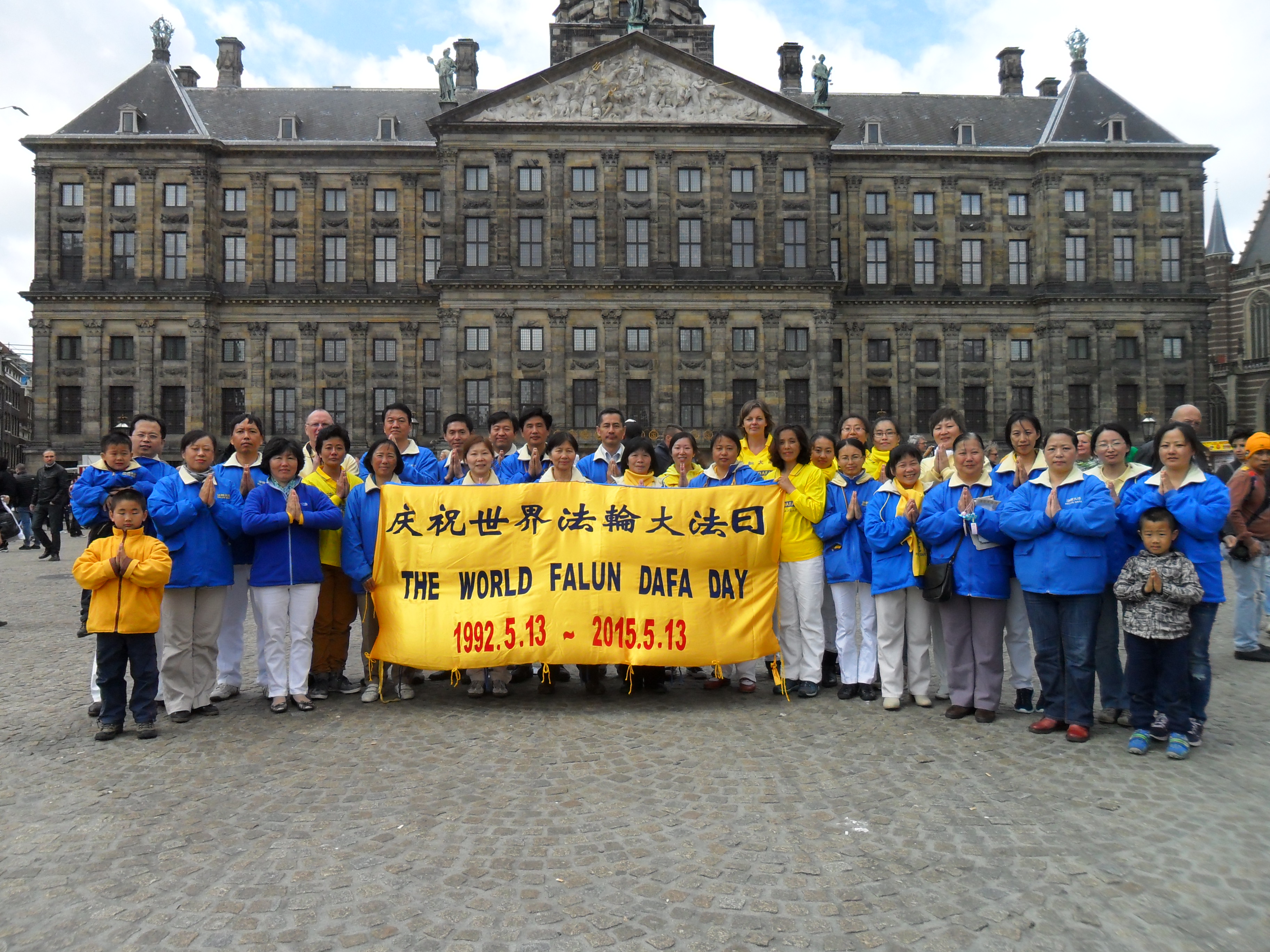 【明慧网二零一五年五月十一日】二零一五年五月九日星期六,荷兰法轮功学员来到首都阿姆斯特丹王宫前达姆广场举办活动,庆祝世界法轮大法日,恭祝慈悲伟大的师尊华诞。