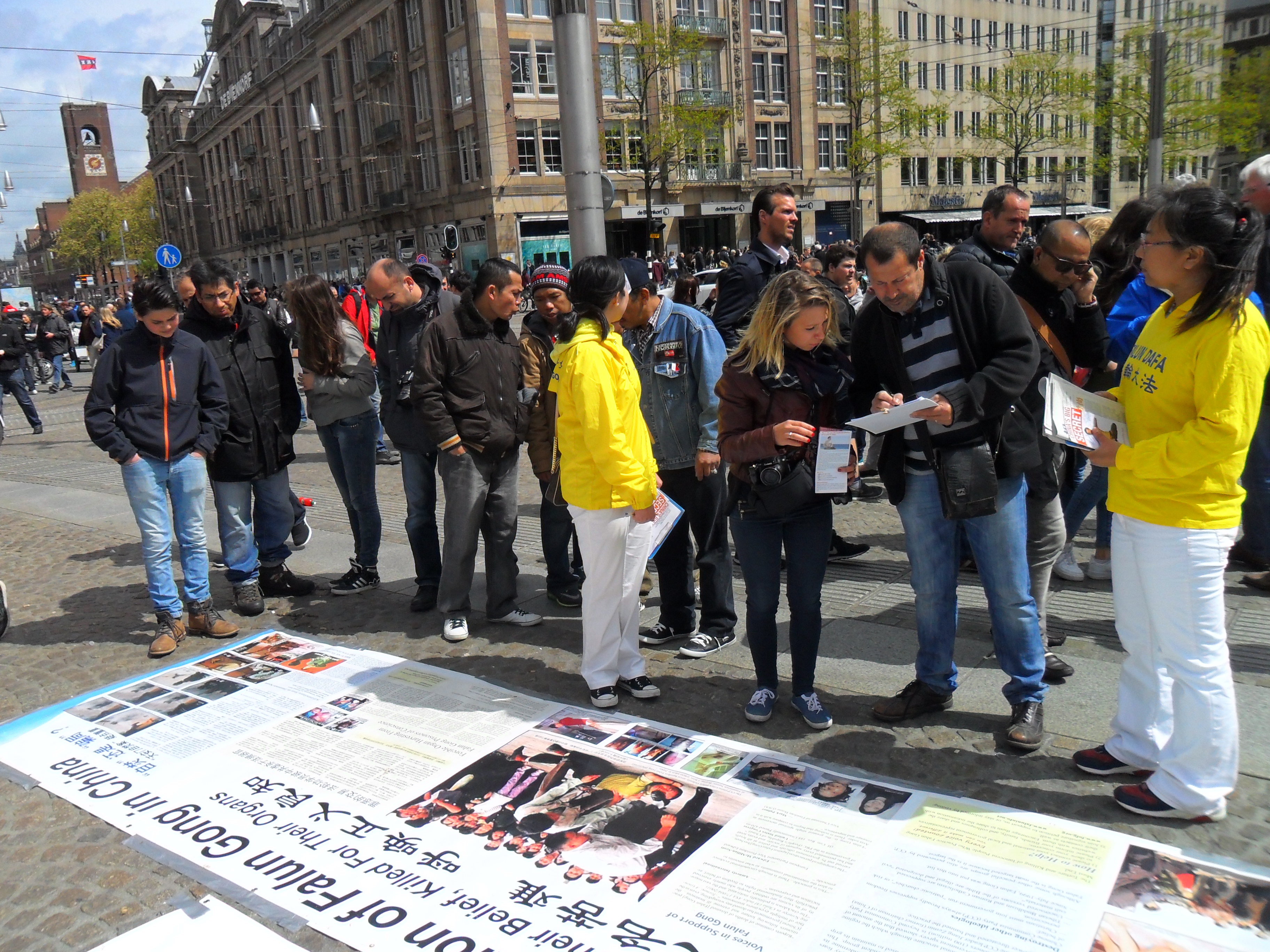 阿姆斯特丹王宫前达姆广场上,游客签名支持法轮功反迫害
