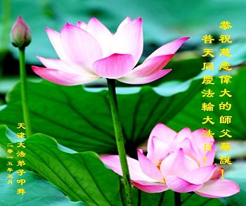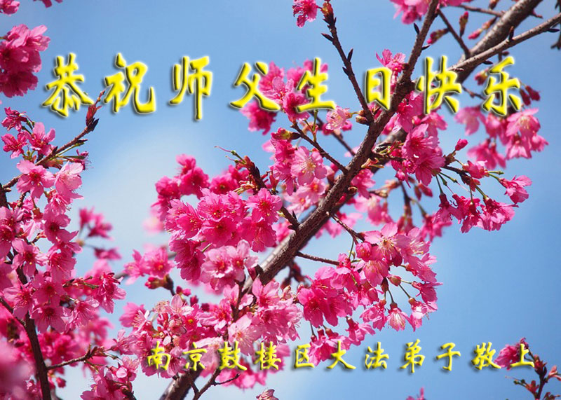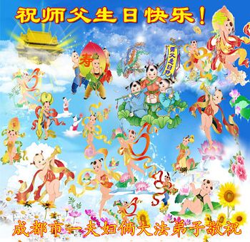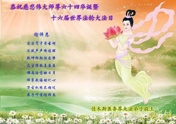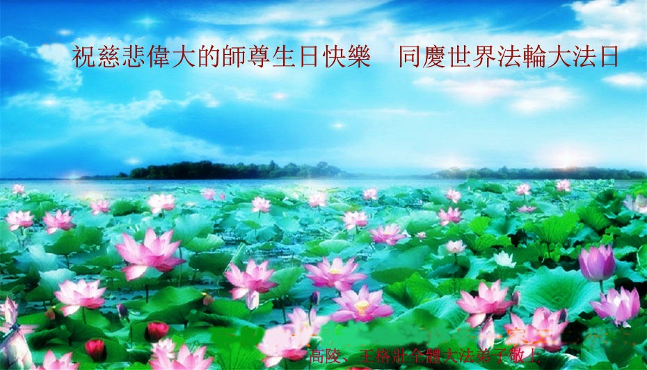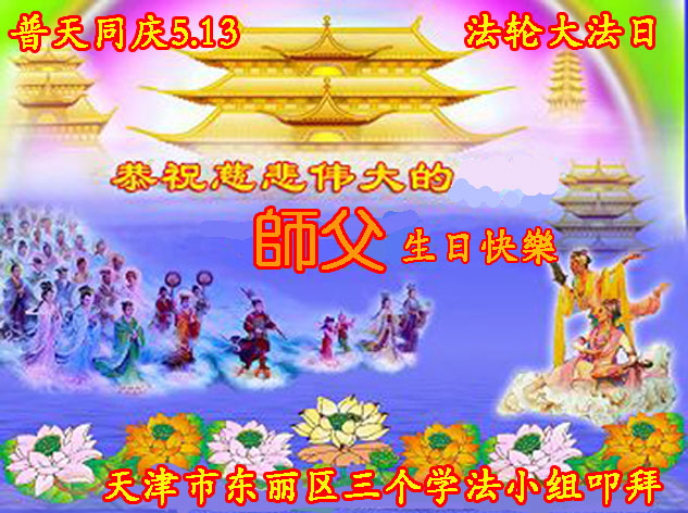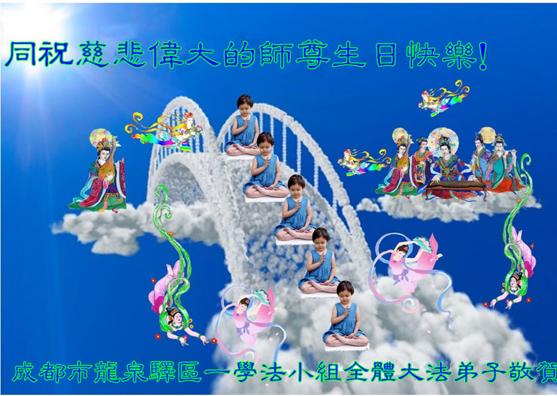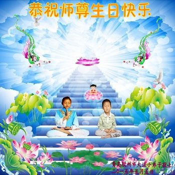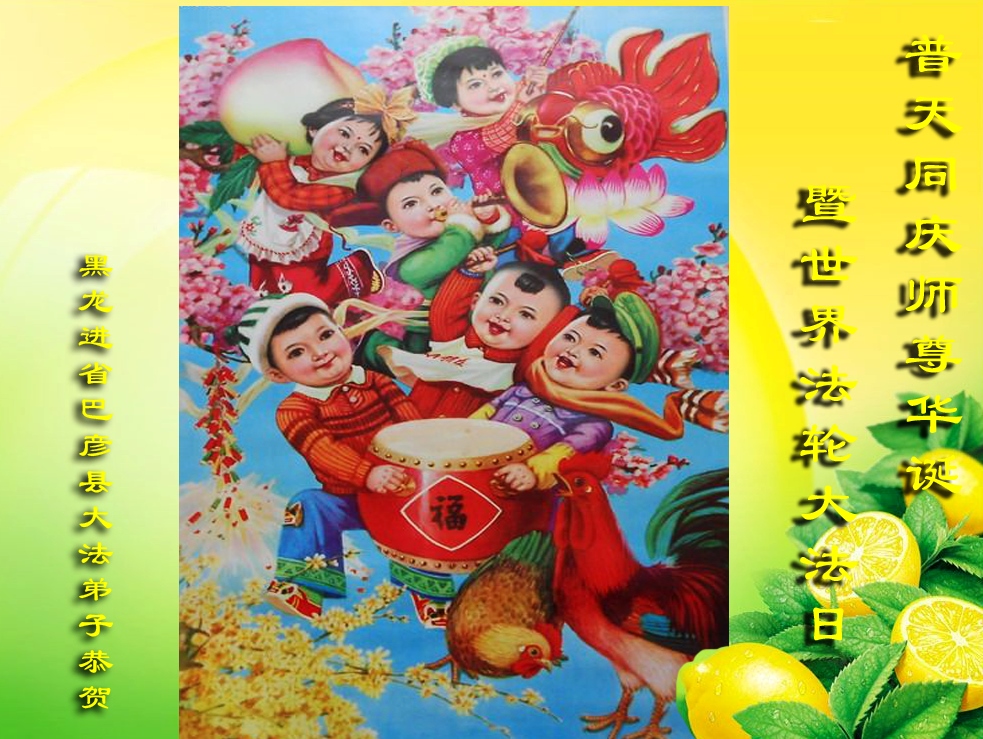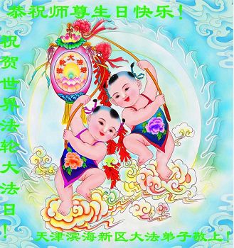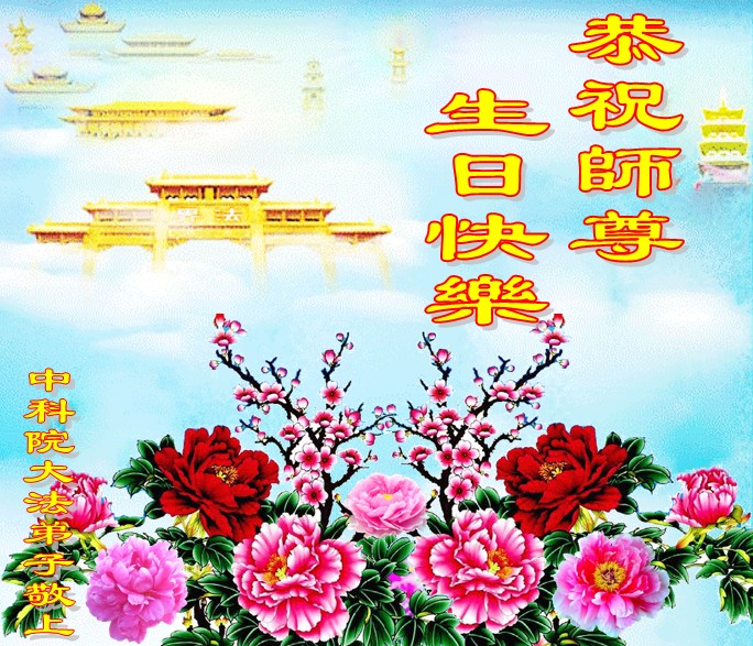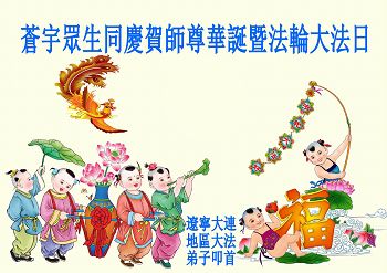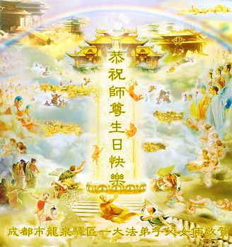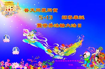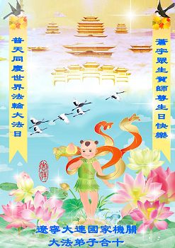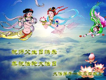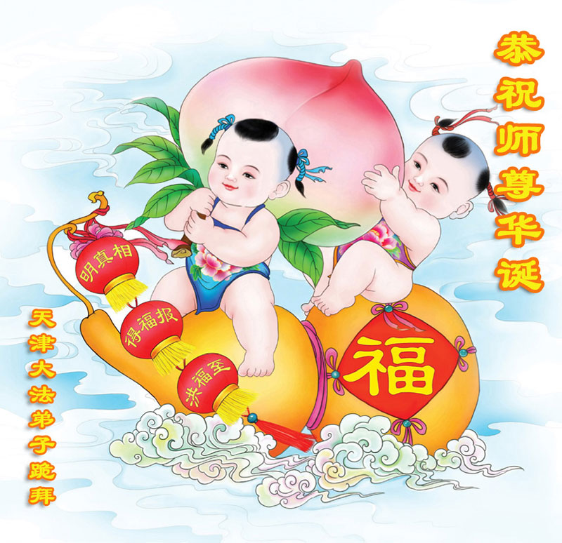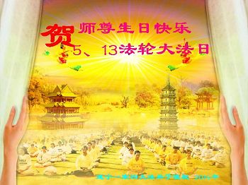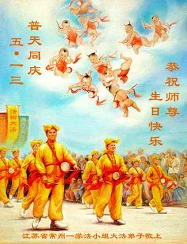 鼓乐喧天庆佳节,欢歌笑语满人间,普天同庆大法日,同祝师尊生日好,苍穹净化人觉醒,三退大潮突两亿,法徒感恩师尊度,弟子精進助师行。