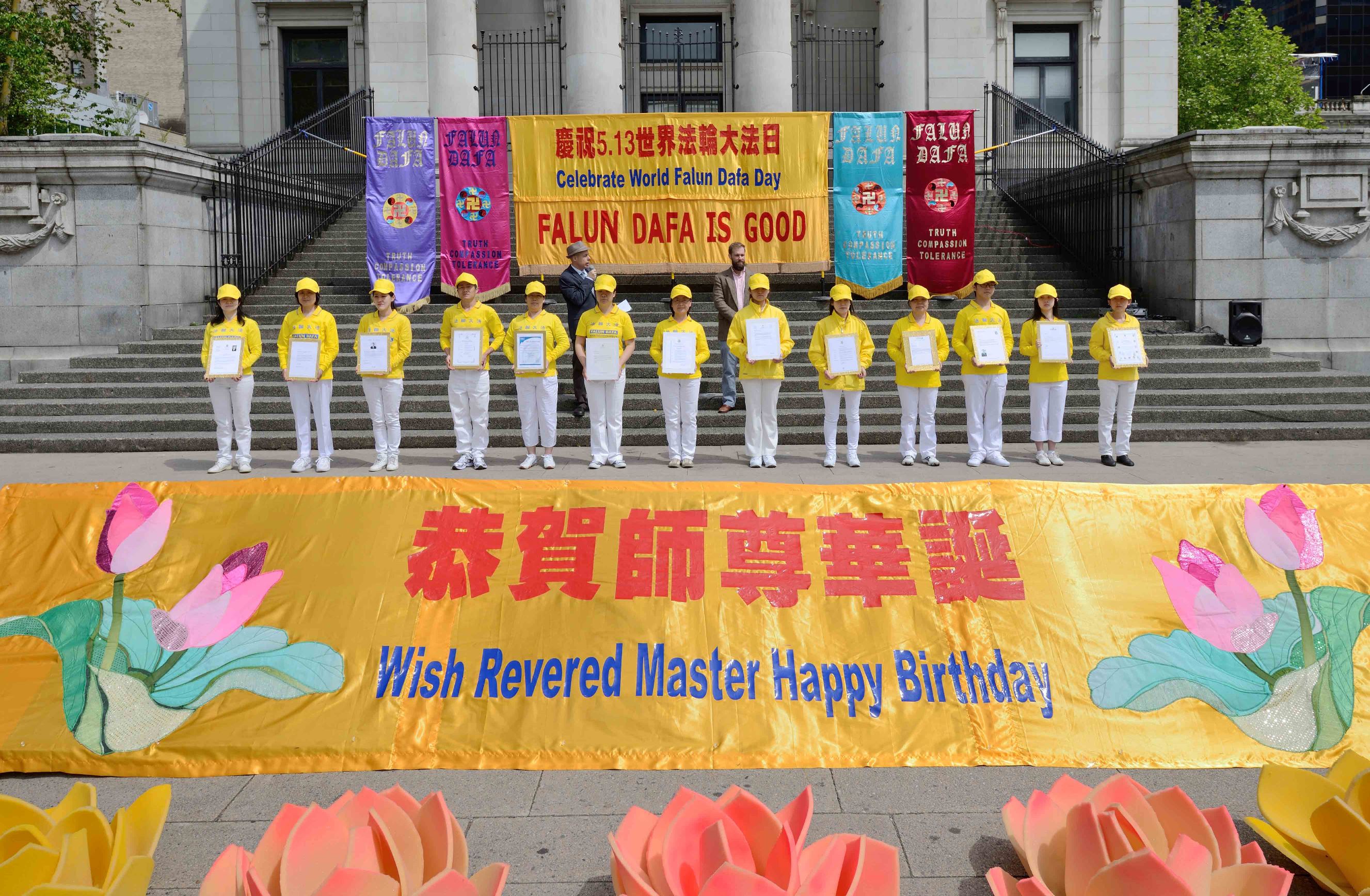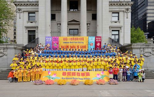 法轮大法弘传二十三周年,造福上亿世人,来参加活动的温哥华法轮大法学员有沐浴法光长大的小弟子,有经历了十几年风风雨雨的老学员,有主流社会的精英,有在迫害中走入修炼的新学员,大家用不同的表达方式,赞颂法轮大法的美好,感恩师父,广传“真、善、忍”福音。