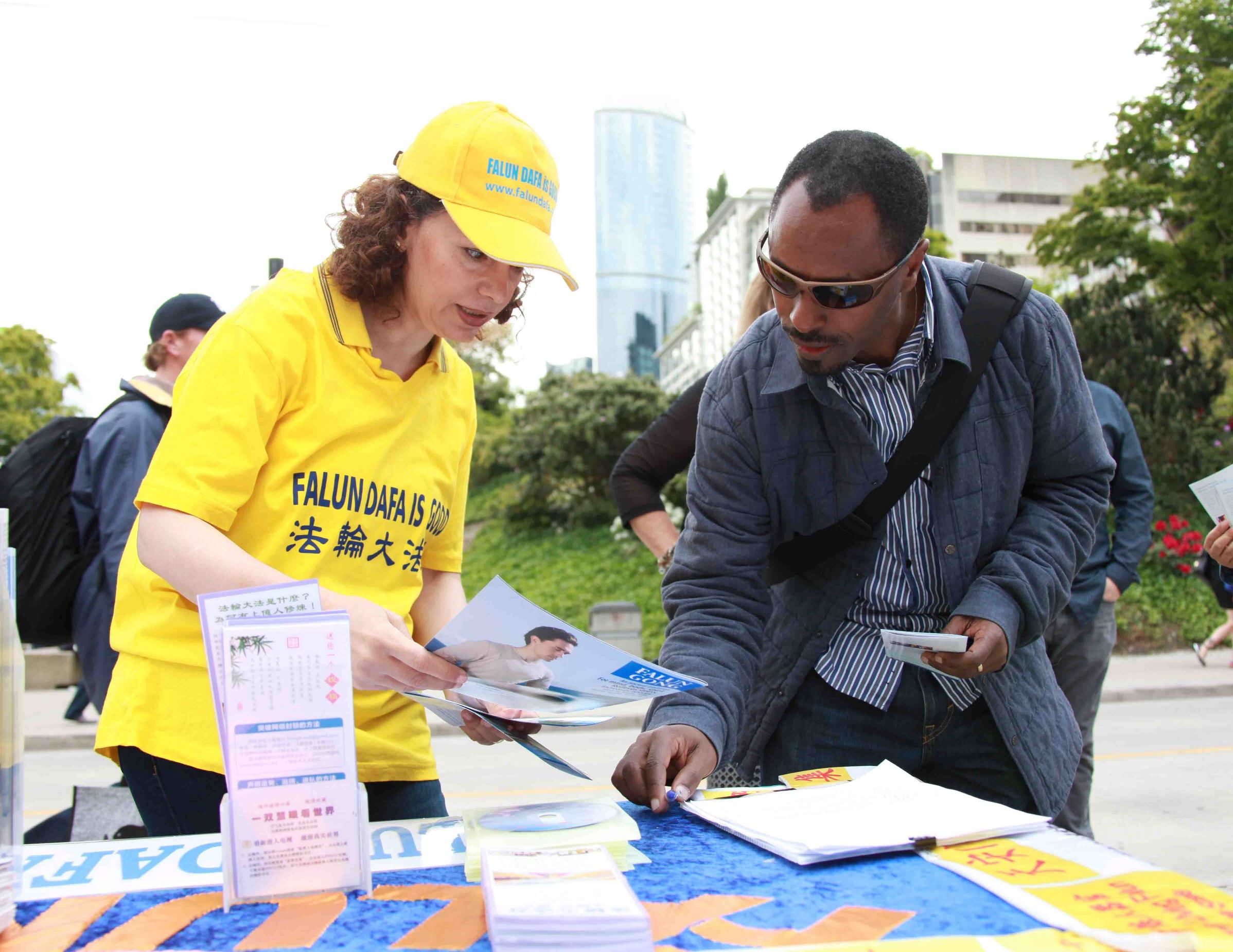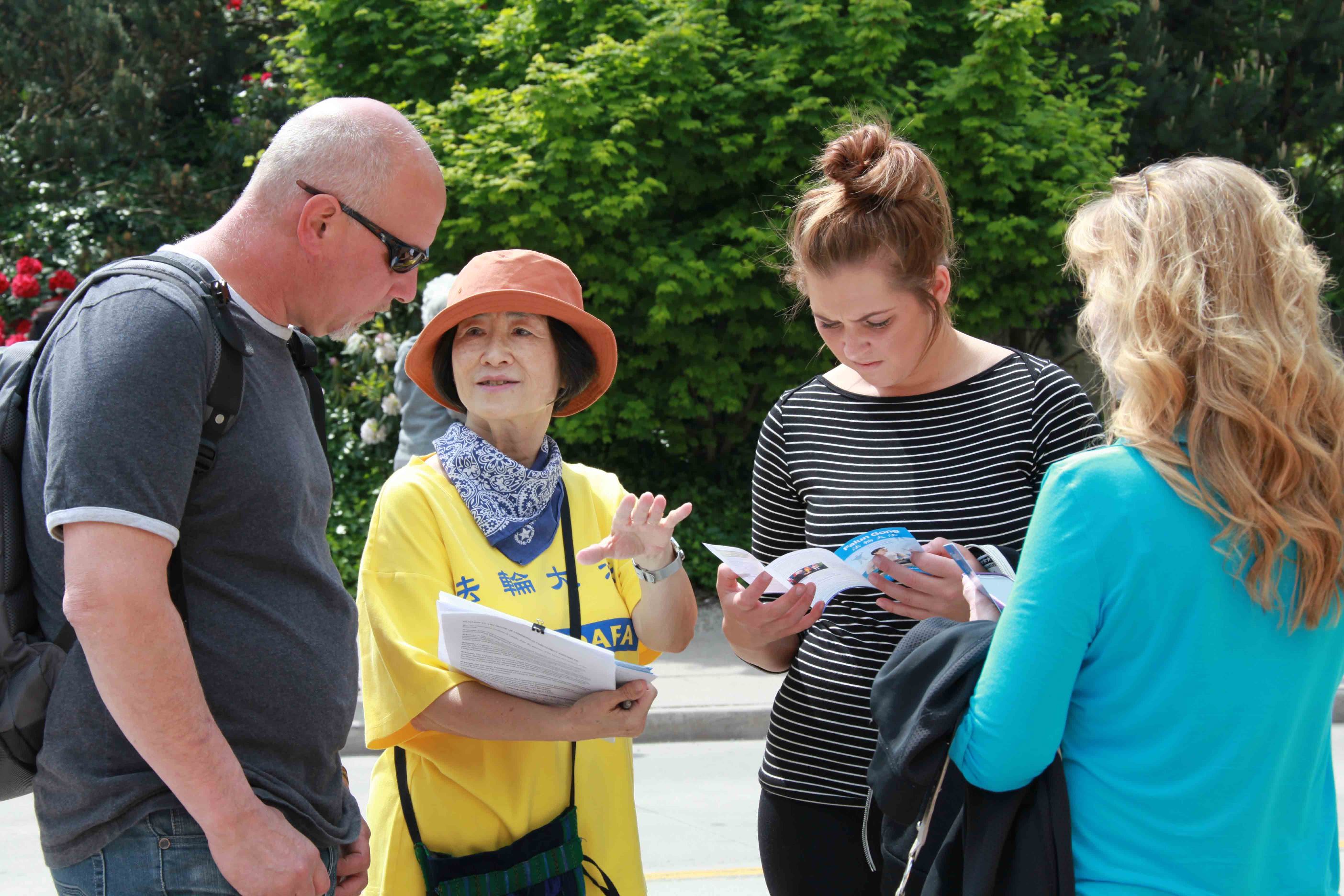 【明慧网二零一五年五月十二日】(明慧记者张然温哥华报道)二零一五年五月十日,加拿大温哥华法轮功学员在市中心艺术馆前举行活动,庆祝法轮大法弘传二十三周年,恭祝法轮功创始人李洪志先生六十四华诞。不同年龄、不同职业、不同族裔的法轮大法学员谢师恩,赞颂真善忍,传福音,与世人分享法轮大法的美好。