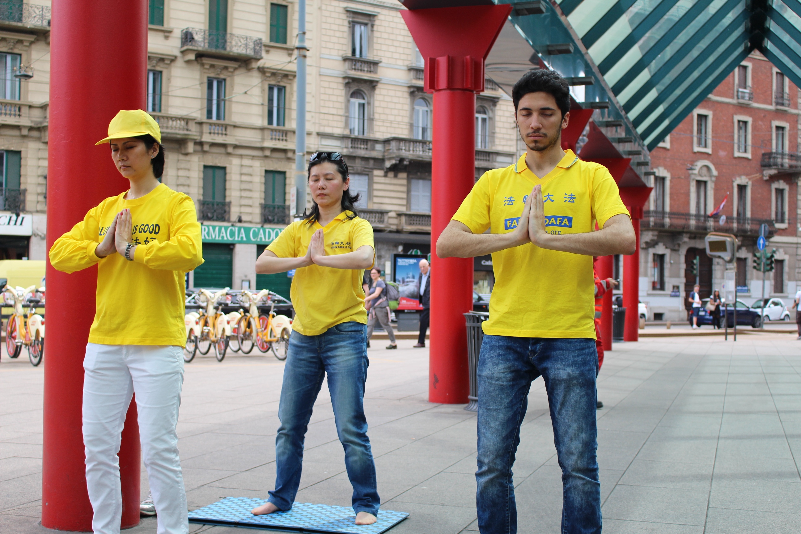 图1:法轮功学员在米兰市中心街头炼功,向人们介绍功法,庆祝世界法轮大法日