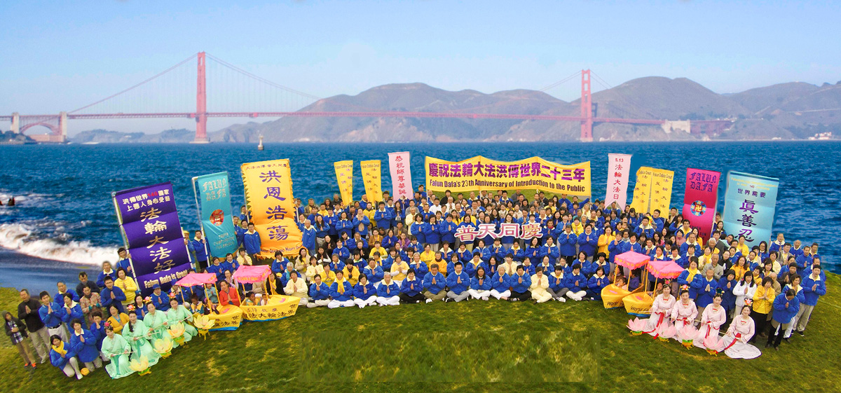 图:法轮功学员在金门大桥附近恭祝师父生日快乐